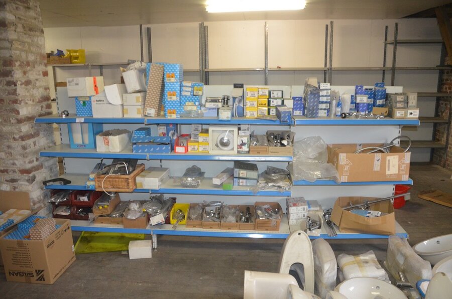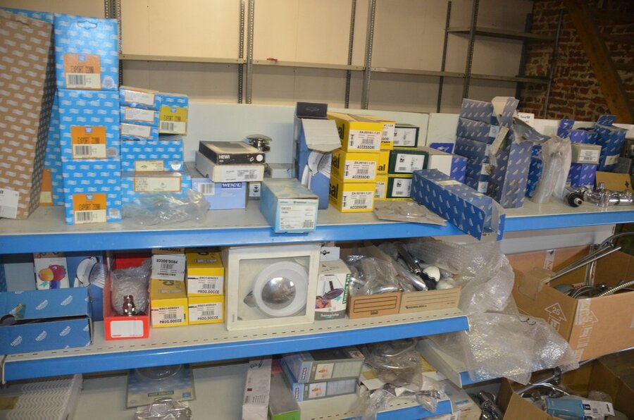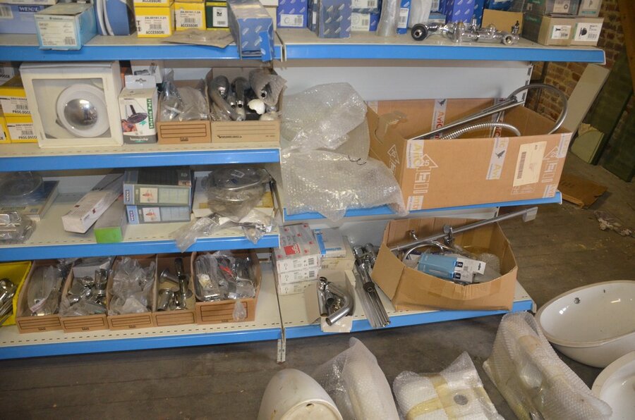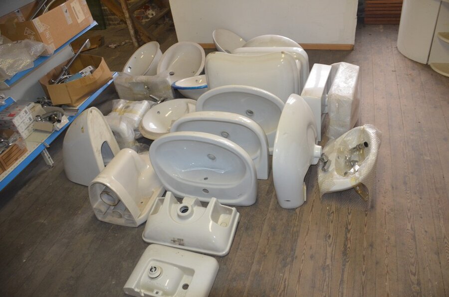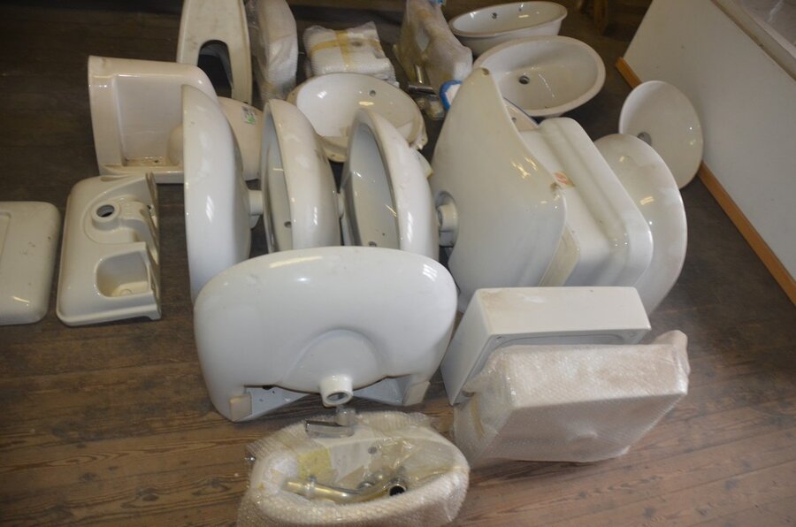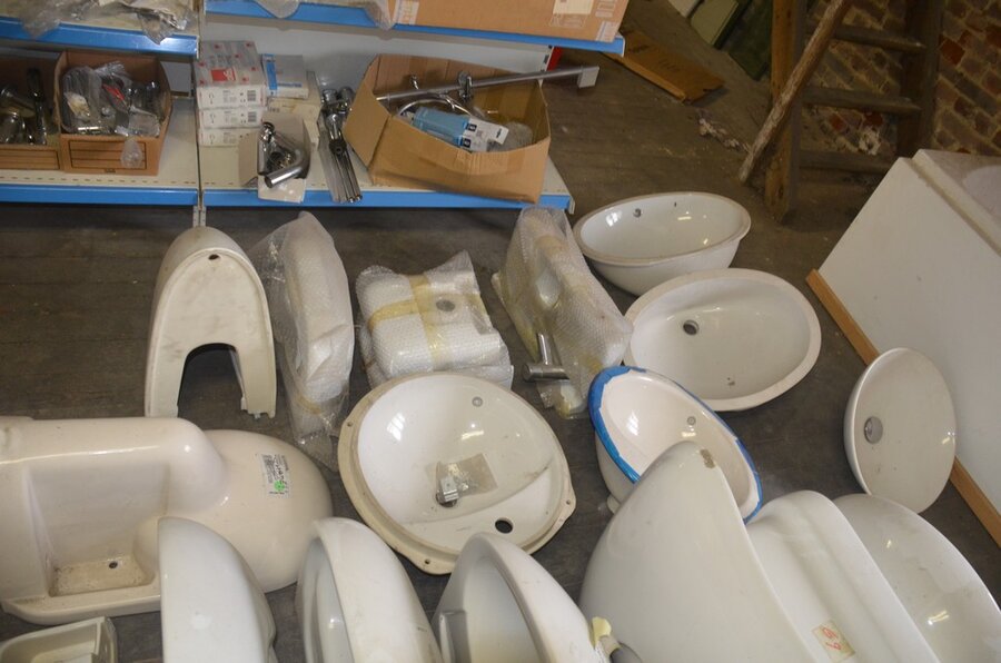 20 Wastafels, badkuip, WC pot, 4 WC stortbakken, 7 metalen rekken, partij badkamertoebehoren, zeephouder, wc rol houder, wc borstel, douchekoppen, kranen, verlichting, enz