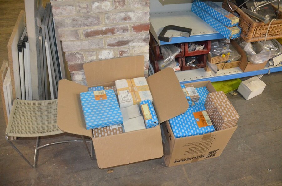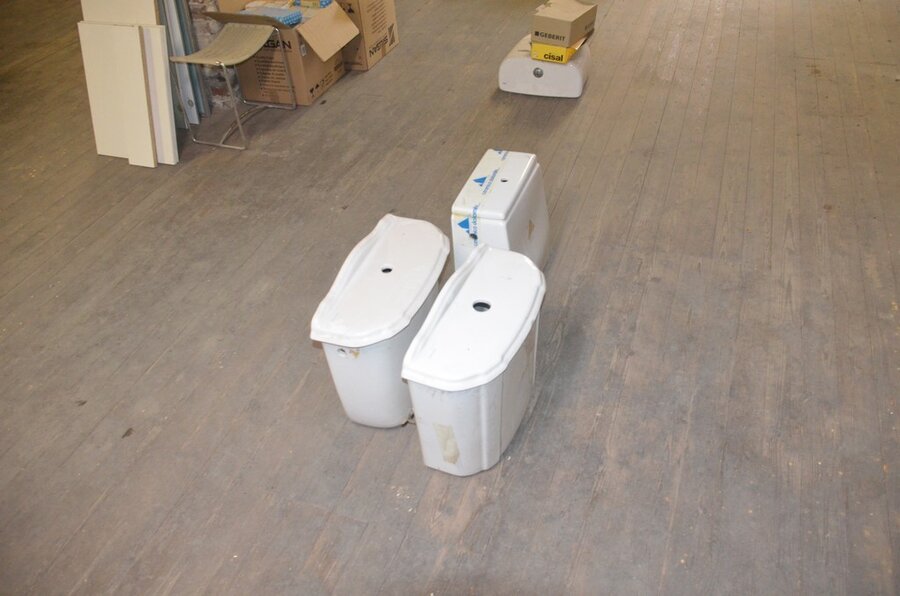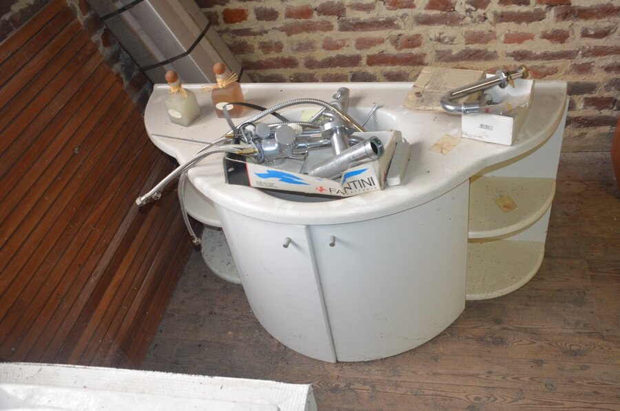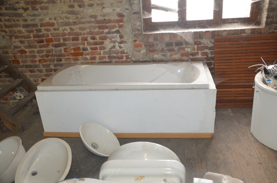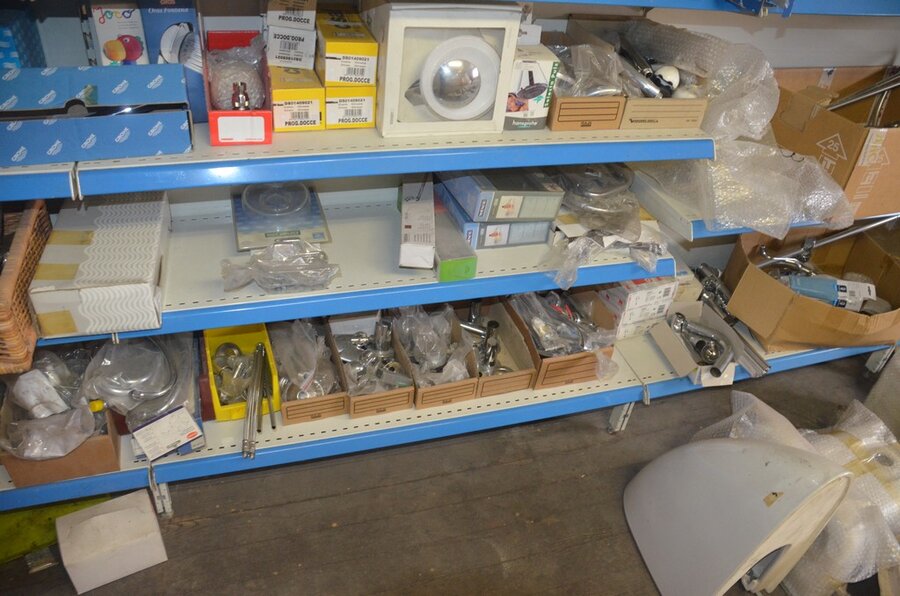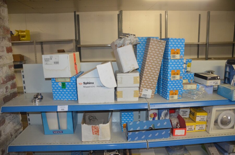 20 Wastafels, badkuip, WC pot, 4 WC stortbakken, 7 metalen rekken, partij badkamertoebehoren, zeephouder, wc rol houder, wc borstel, douchekoppen, kranen, verlichting, enz
