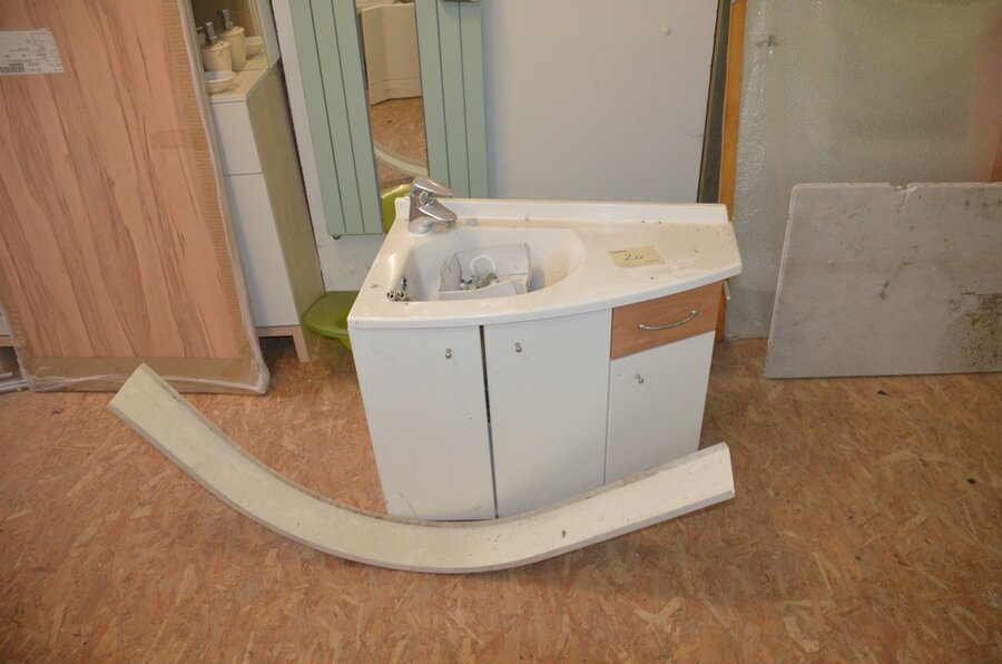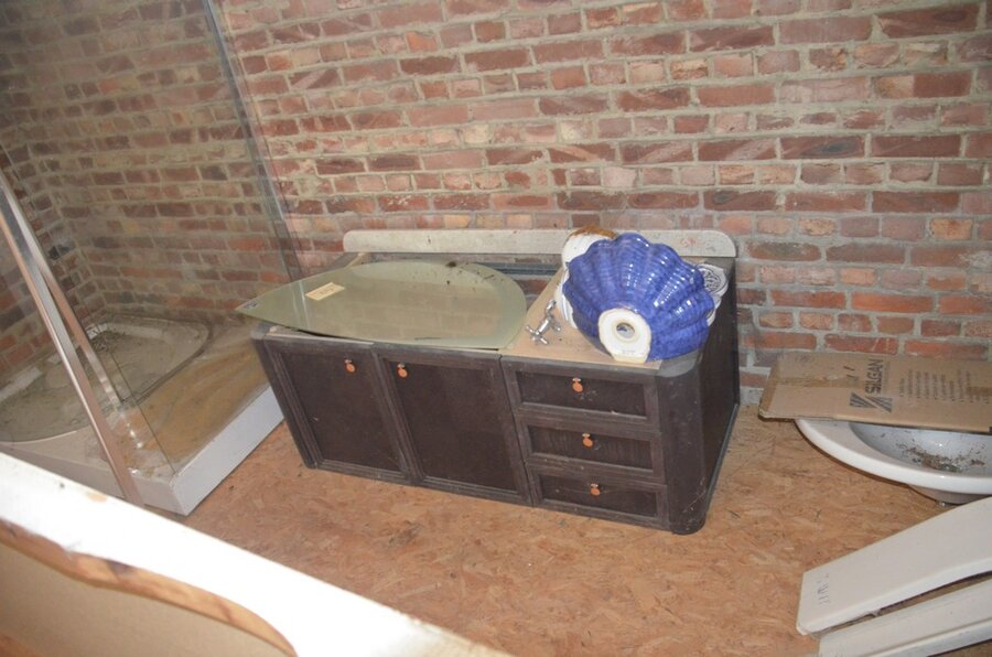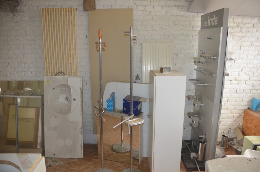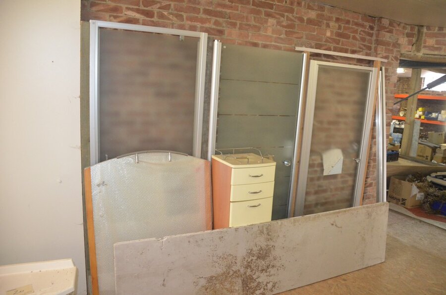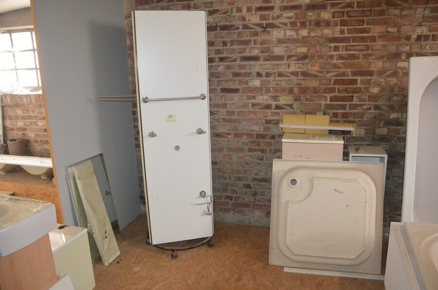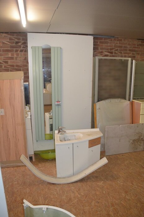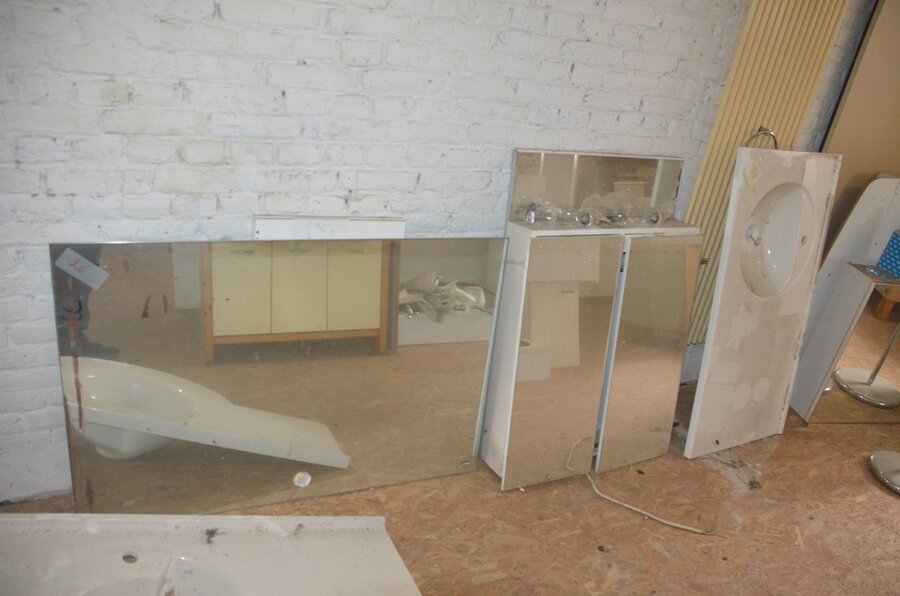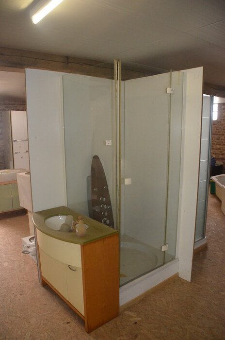 5 Douchecabines, 3 badkuipen, 9 wastafels, 3 radiatoren, partij badkamermeubels, spiegels, muurbeslag, 3 douchedeuren, 2 kapstokken
