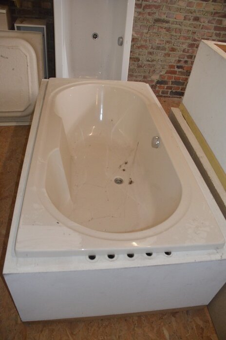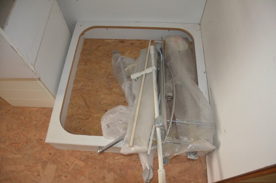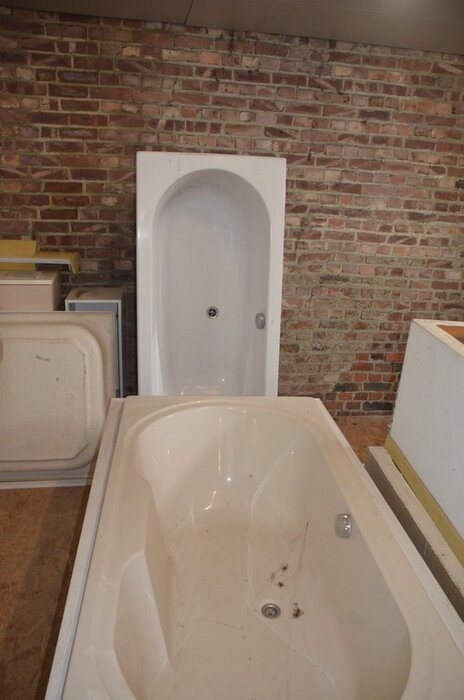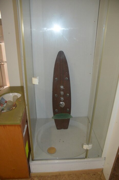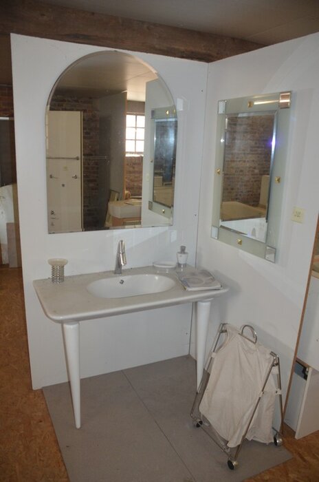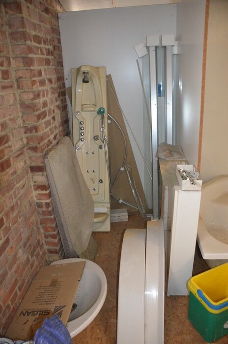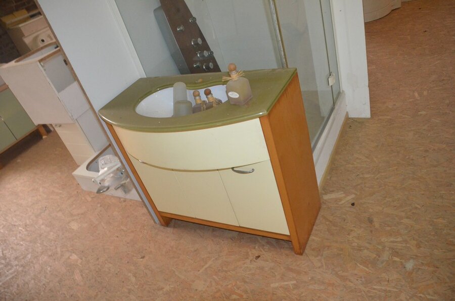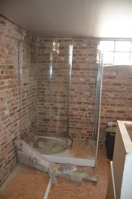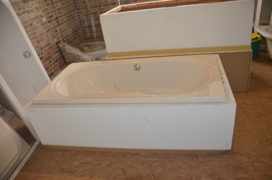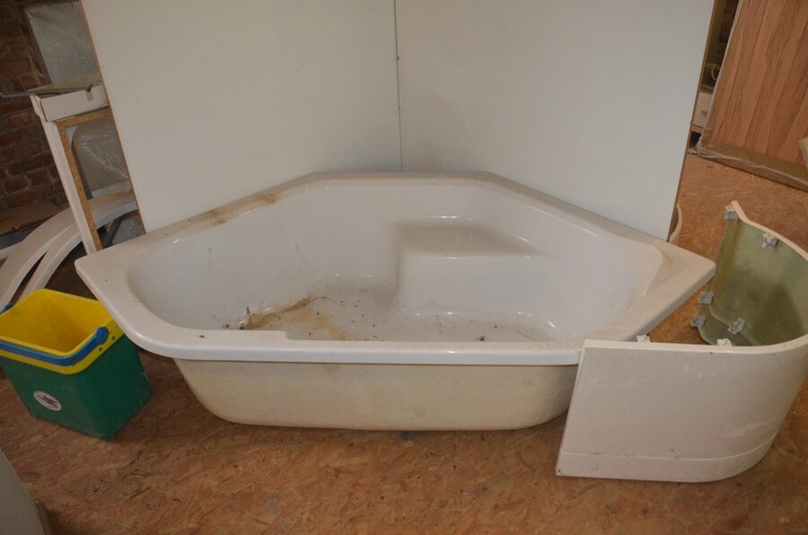 5 Douchecabines, 3 badkuipen, 9 wastafels, 3 radiatoren, partij badkamermeubels, spiegels, muurbeslag, 3 douchedeuren, 2 kapstokken