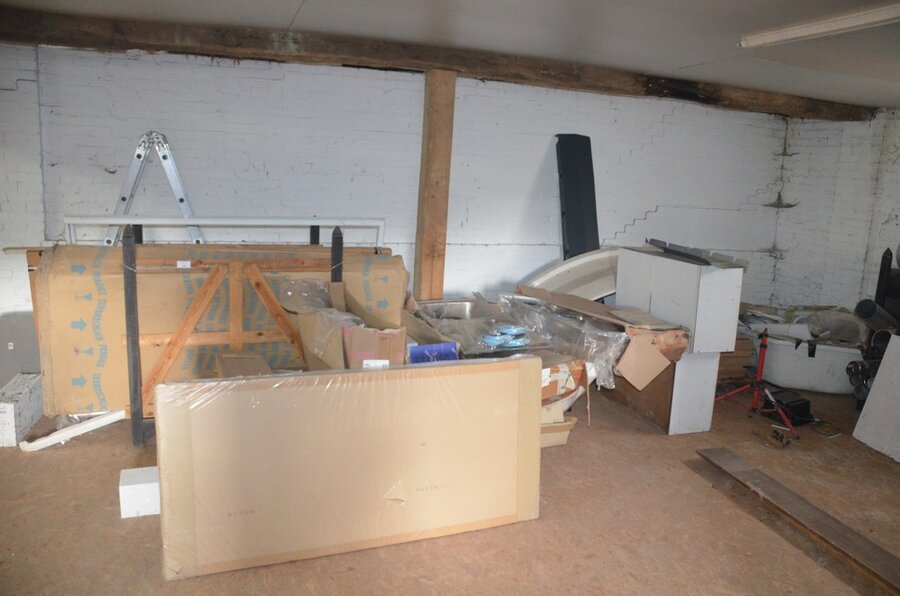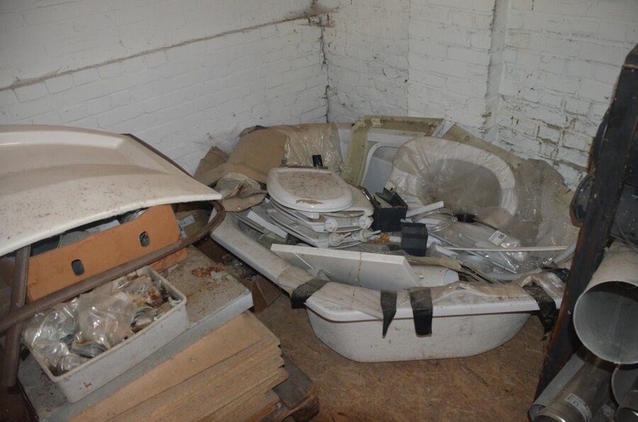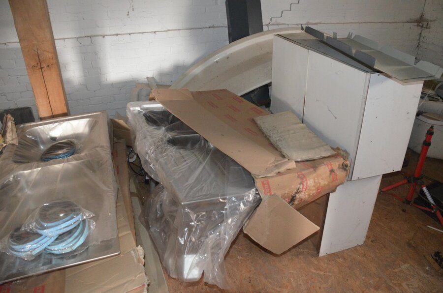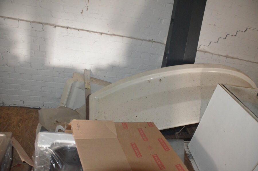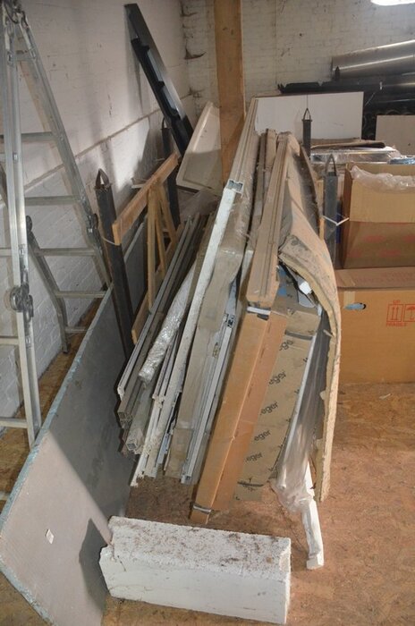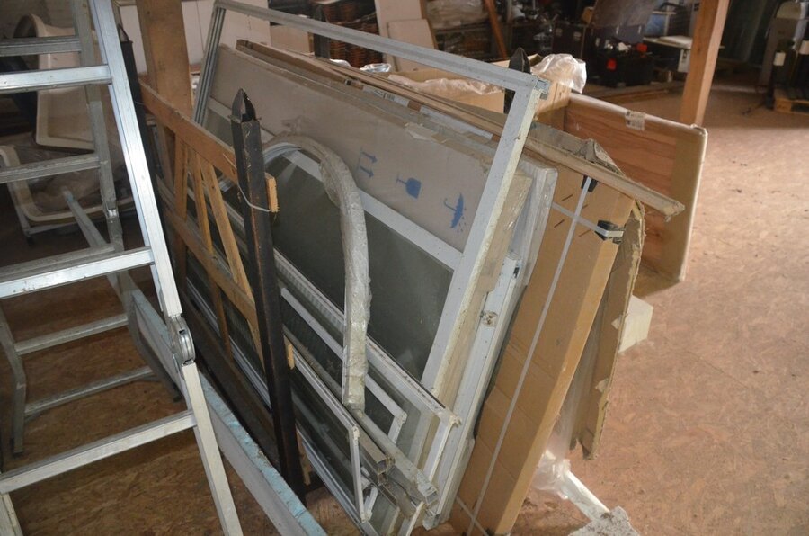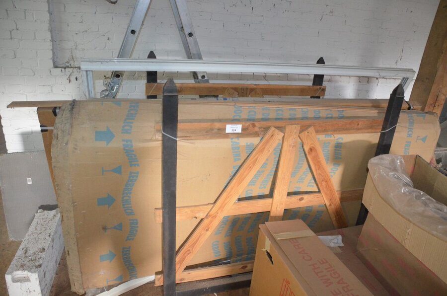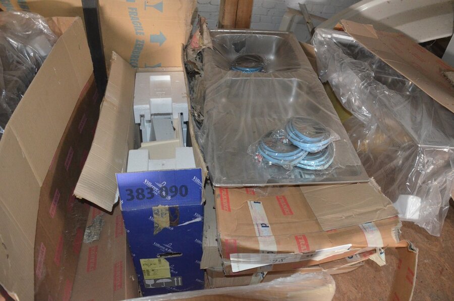 Ca. 8 glazen douchewanden, plooiladder 4x3 treden, 7 rvs spoelbakken, 2 wastafels, 2 badkuipen