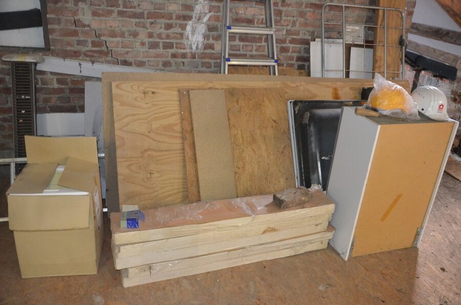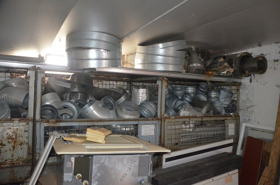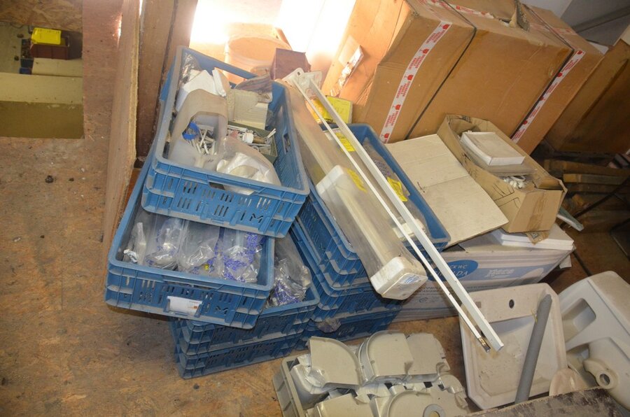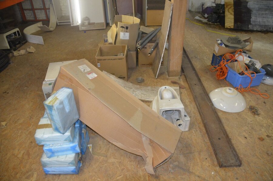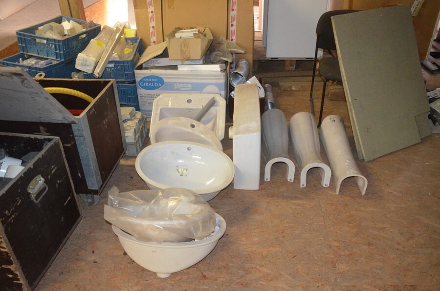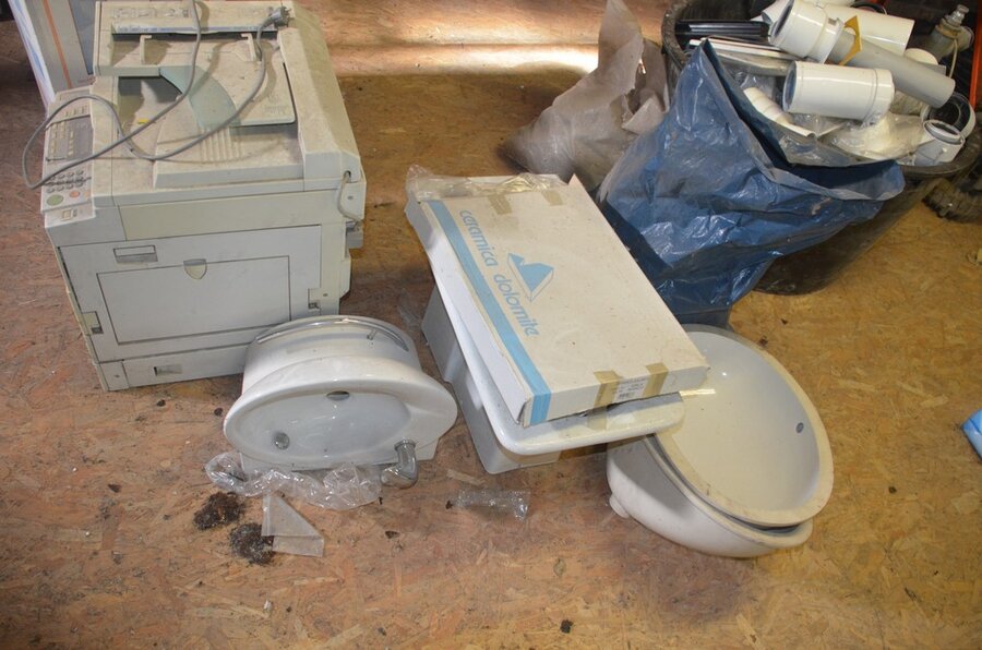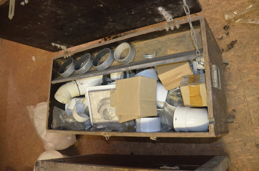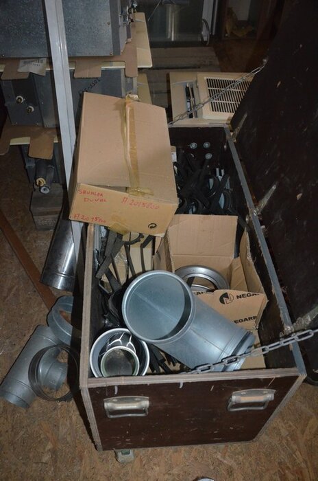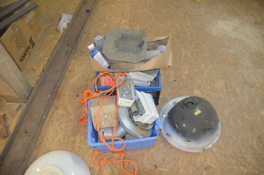 ventilatieaansluitingen, 7 pvc kisten muurbeugels voor radiatoren, 12 wastafels, 2 metalen douchebakken, alu trapladder 6 treden, 2 waterpompen, palletrek bestaande uit 3 kopsteunen 2,3m x 1m en 8 dwarsbalken 4m