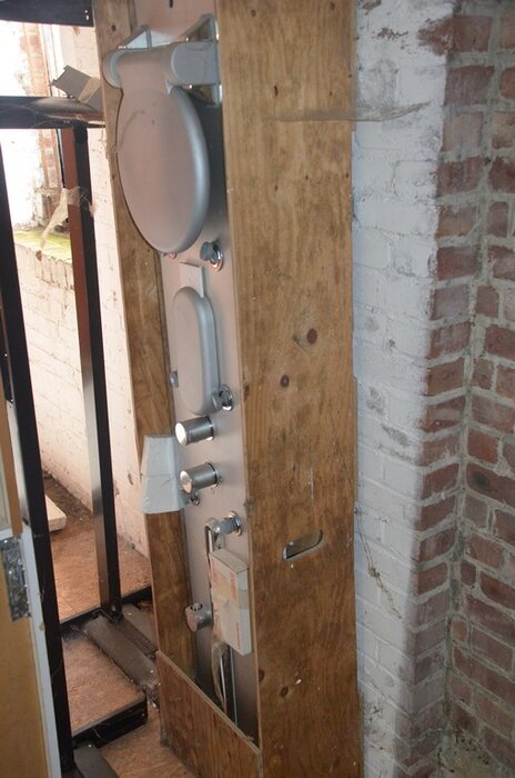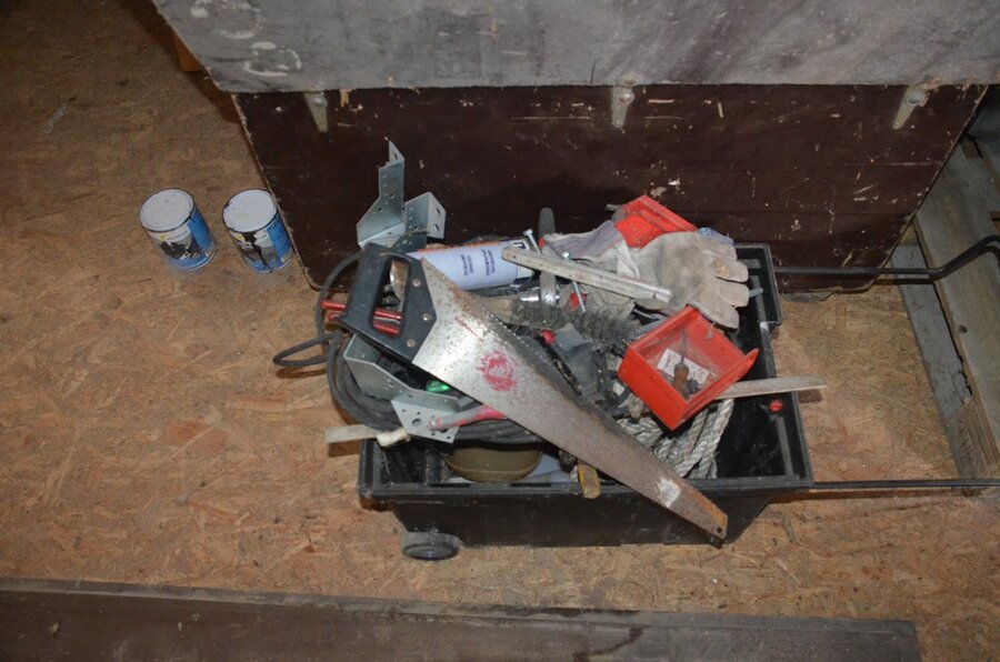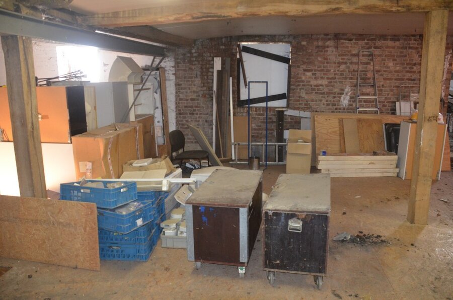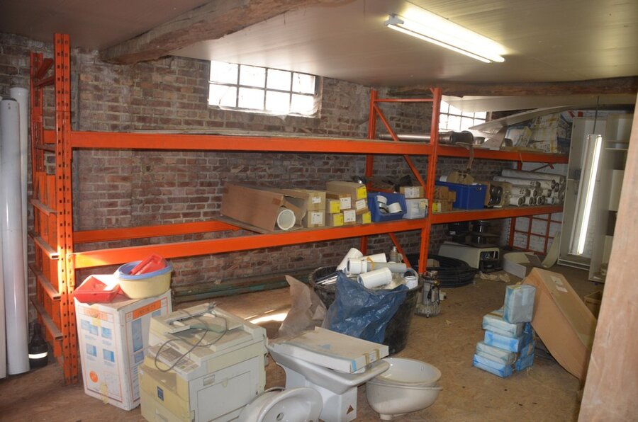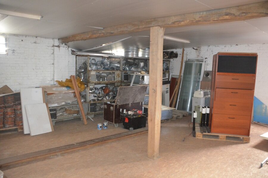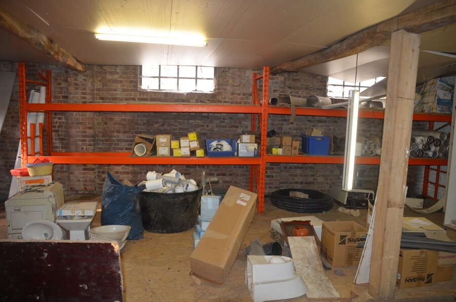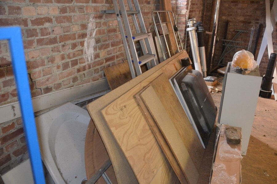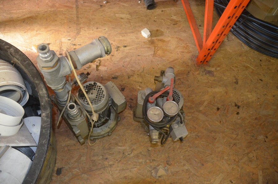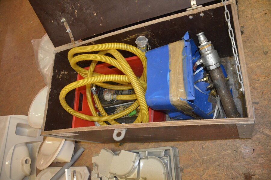 ventilatieaansluitingen, 7 pvc kisten muurbeugels voor radiatoren, 12 wastafels, 2 metalen douchebakken, alu trapladder 6 treden, 2 waterpompen, palletrek bestaande uit 3 kopsteunen 2,3m x 1m en 8 dwarsbalken 4m