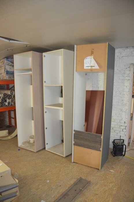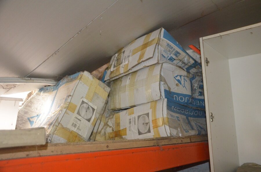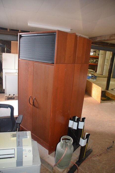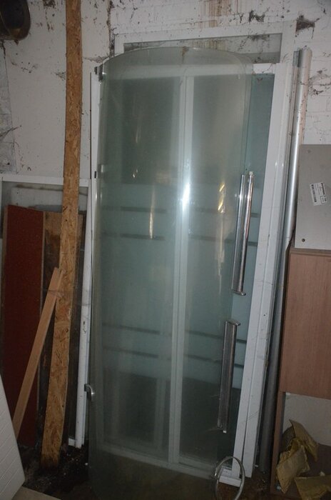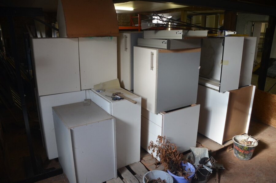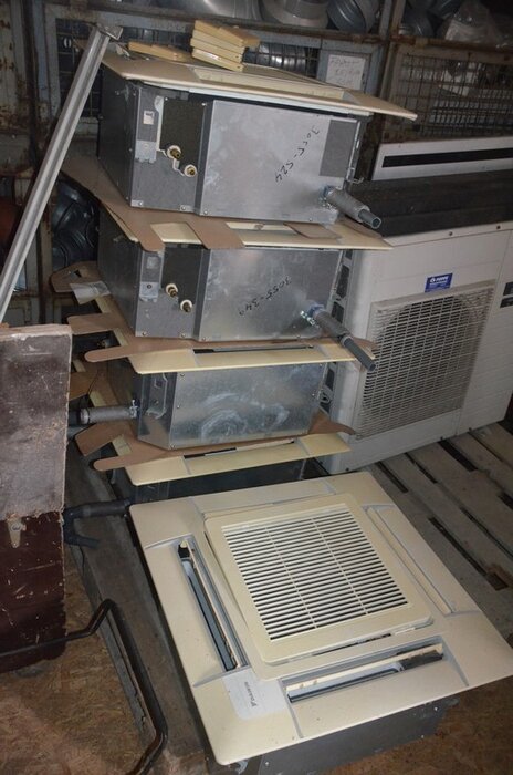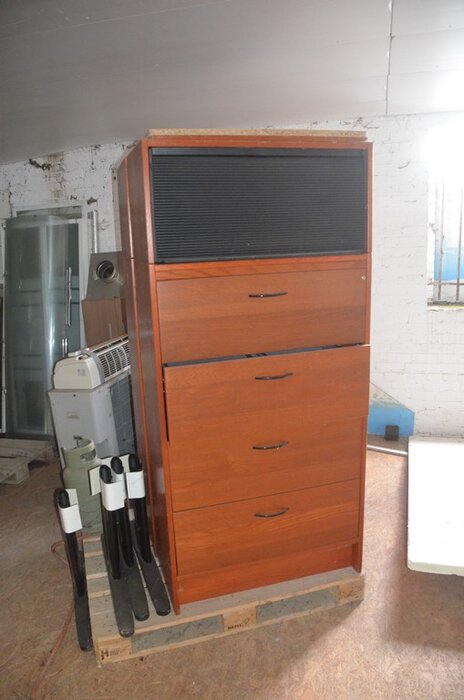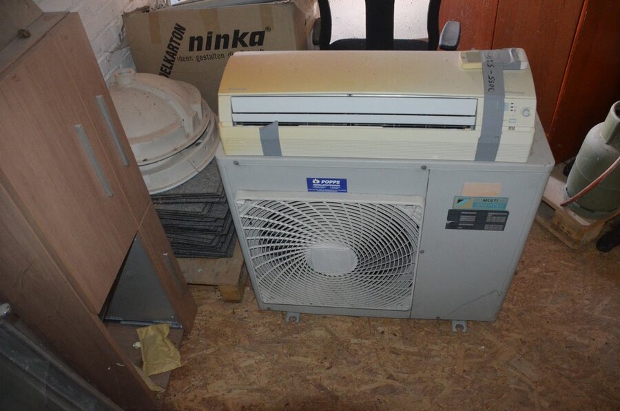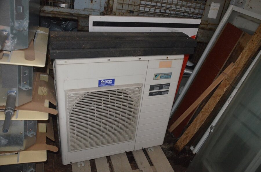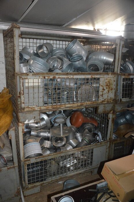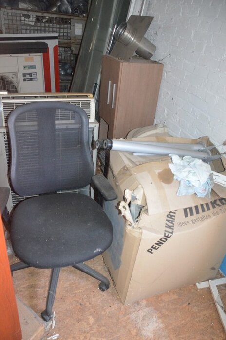 Pallet schouwdelen, 7 metalen palletboxen met galva aansluitingen en bochten, 5 binnenunit gebruikt, 2 buitenunit gebruikt, 5 douchewanden, 2 houten kasten 80x80 4 laden 1 roldeur, bureelstoel zwart, partij oude keukenkasten, 3 kisten op wielen gevuld m