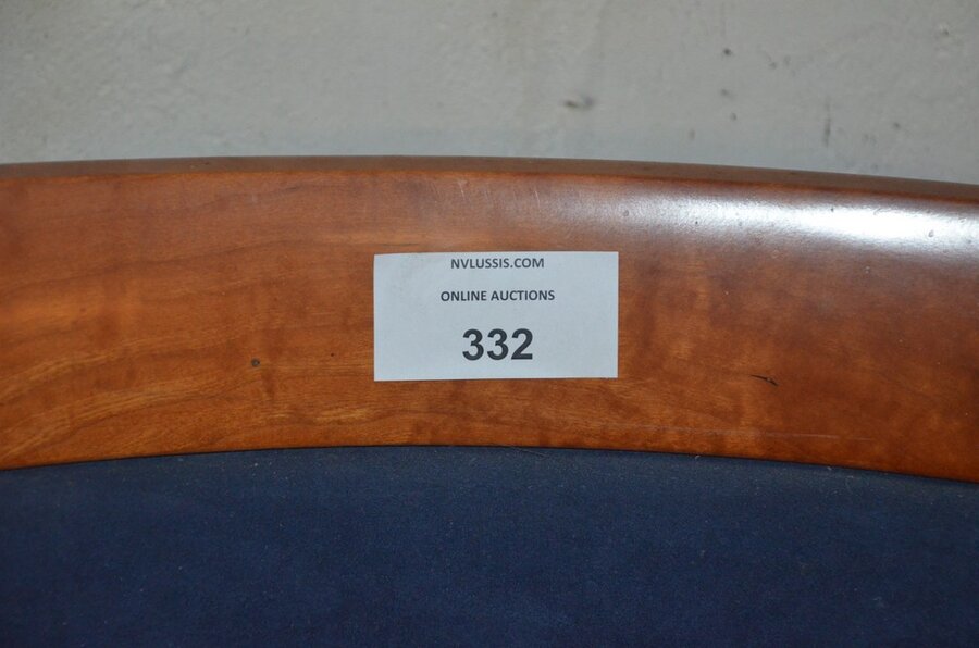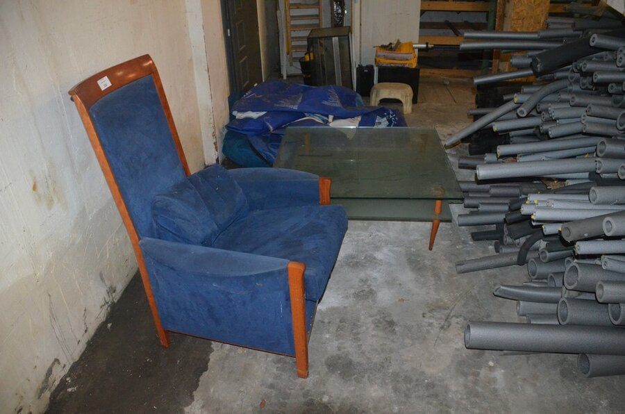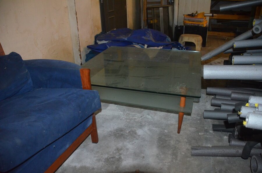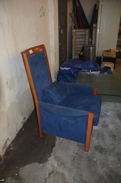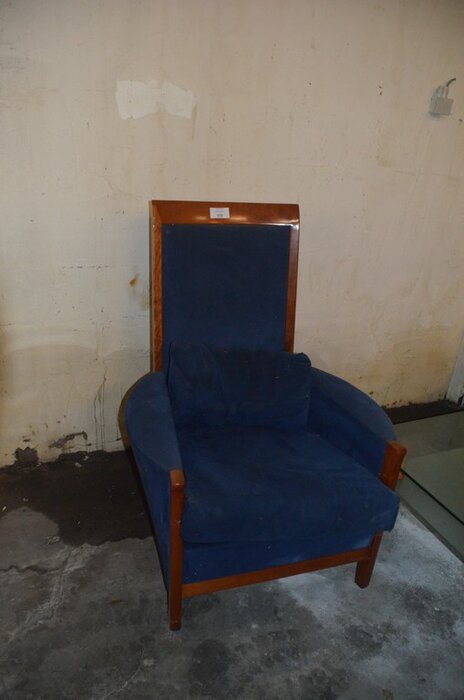 Blauw stoffen zetel met armleuning, glazen salontafel afm. 1m x 1m