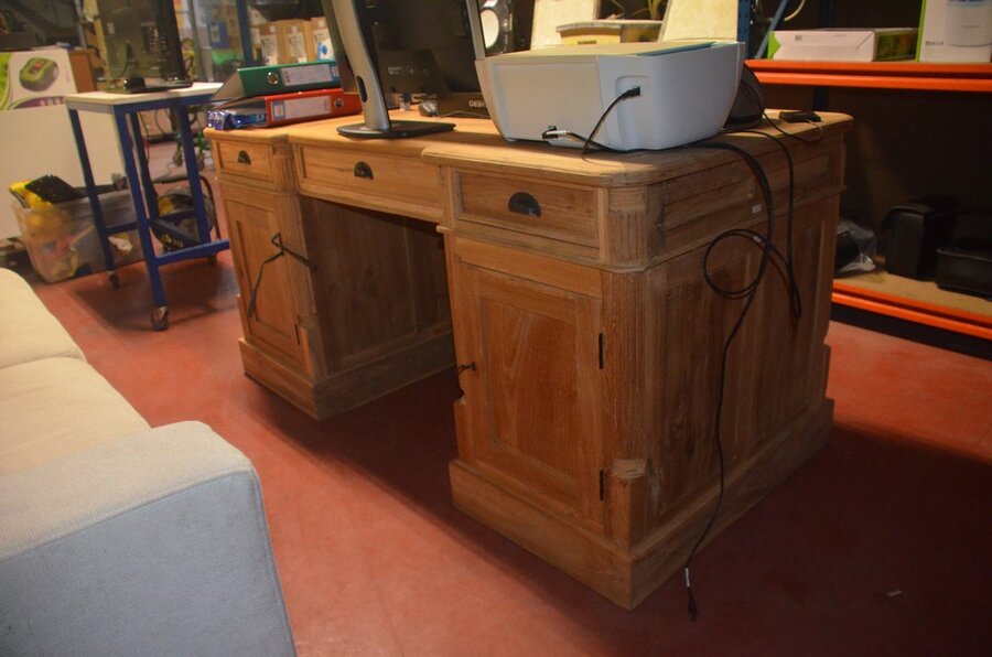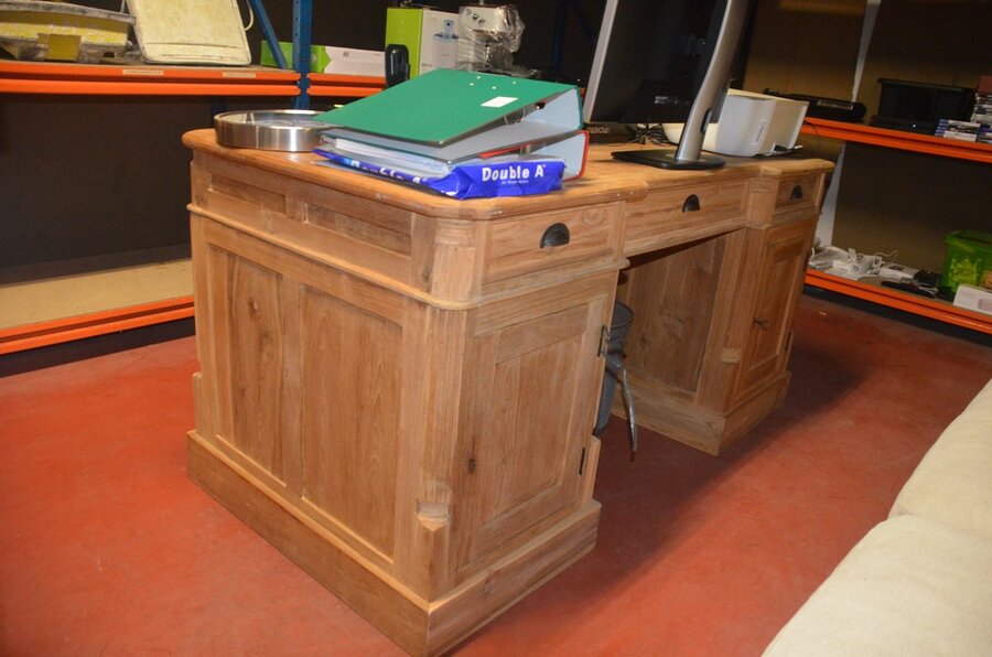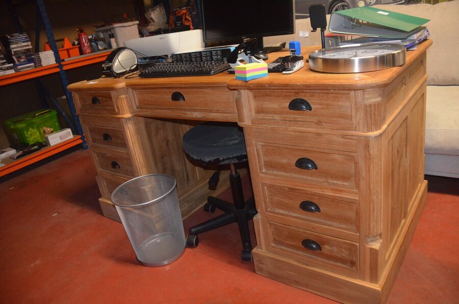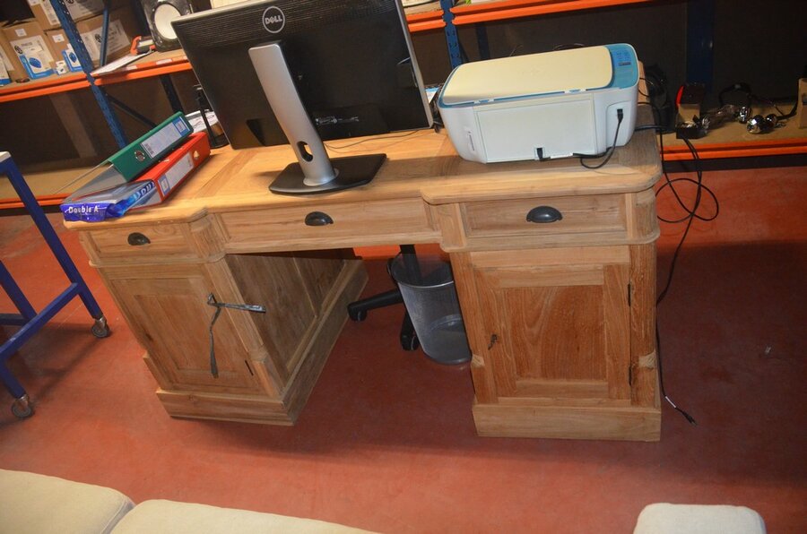 Grenen houten bureel engelse stijl , kruk op wielen, vuilbak (1)