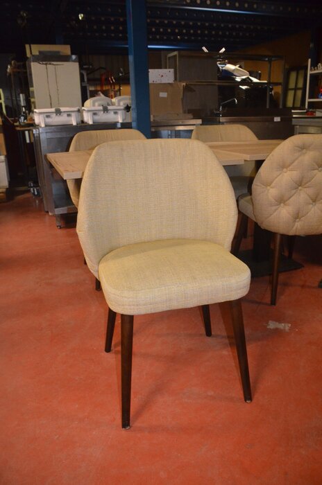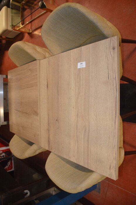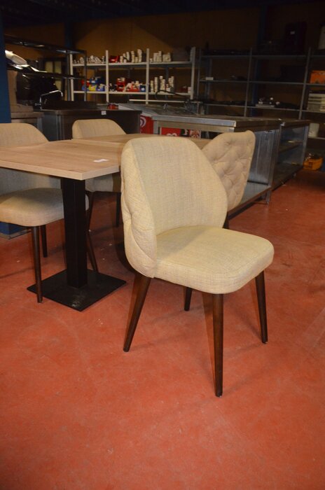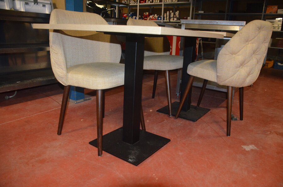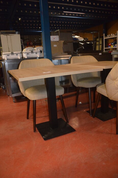 2 vierkante tafels met houten blad en zwart onderstel 80x80 cm, 4 stoelen met beige stof