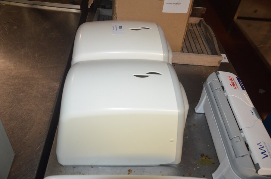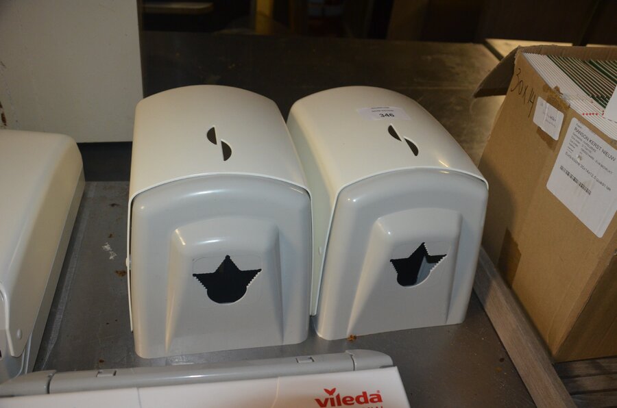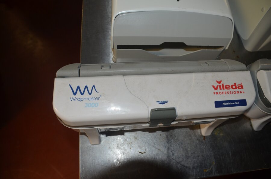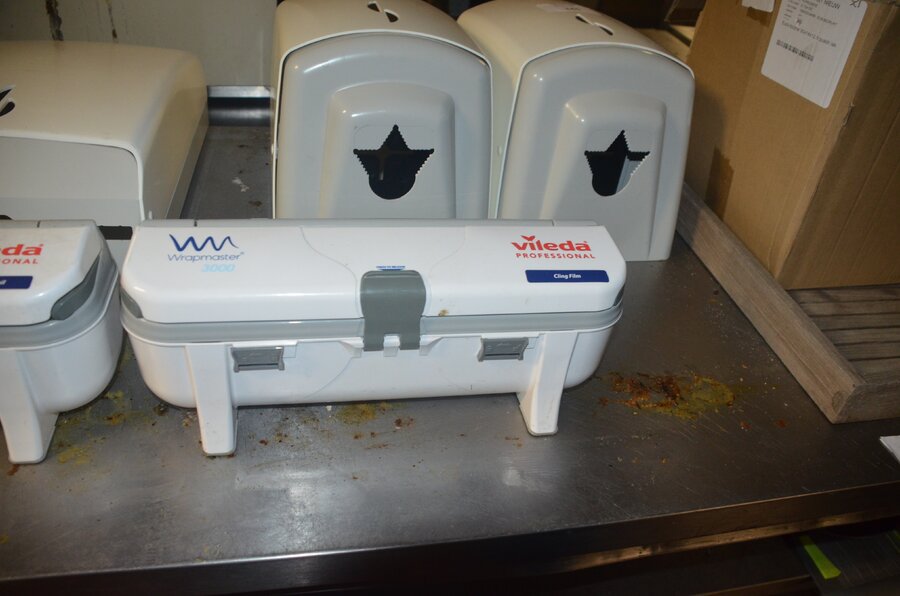 3 keukenrol dispensers, 2 folie dispensers VILEDA Wrapmaster 3000, houten dienblad, ca. 44 taartdozen