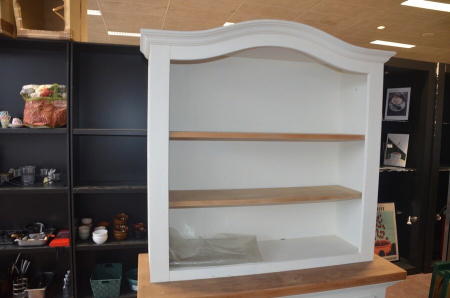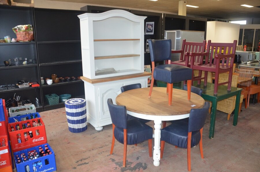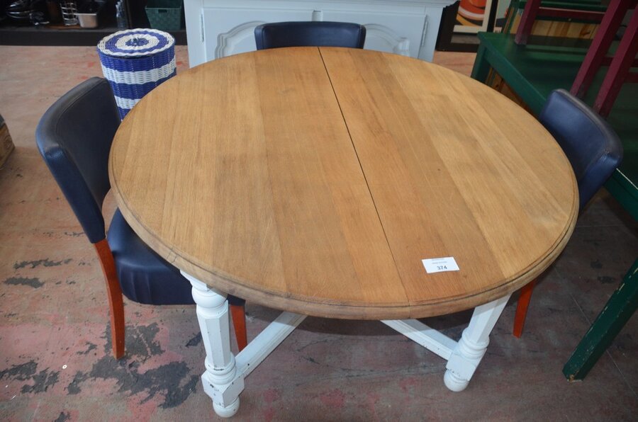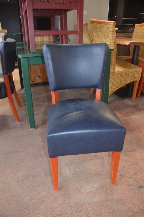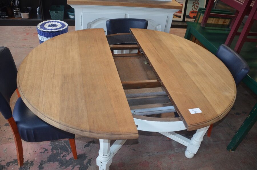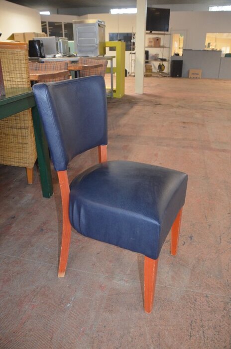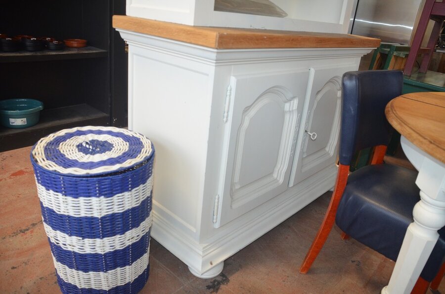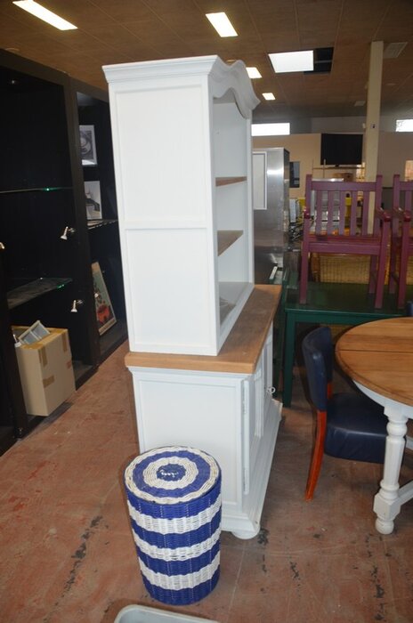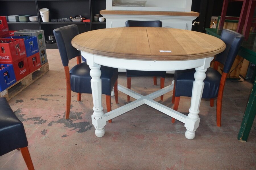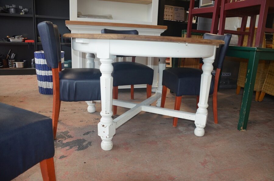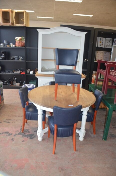 Buffetkast wit 2 deuren afm. 130x55x89, 5 blauw lederen stoelen, wit houten uitschuifbare tafel (2,5,6)