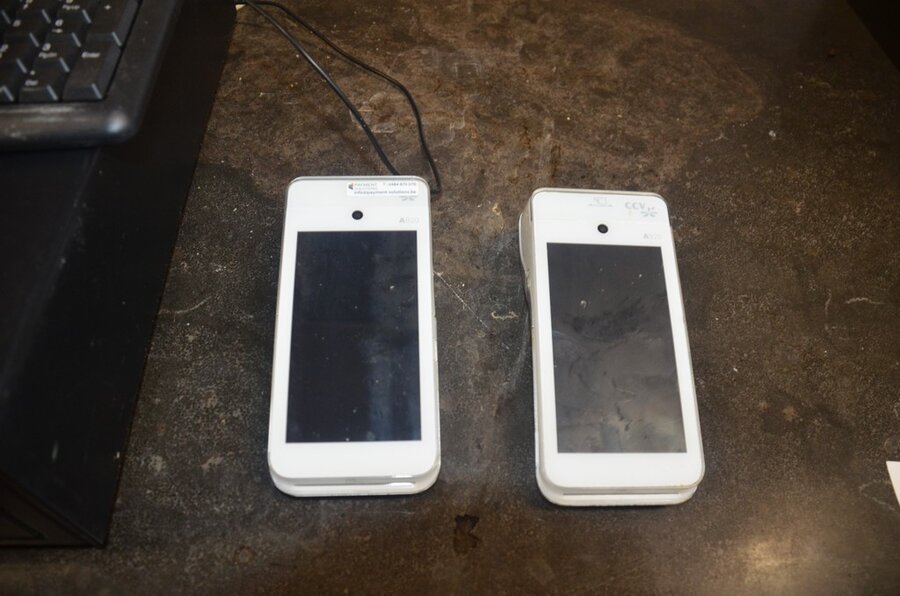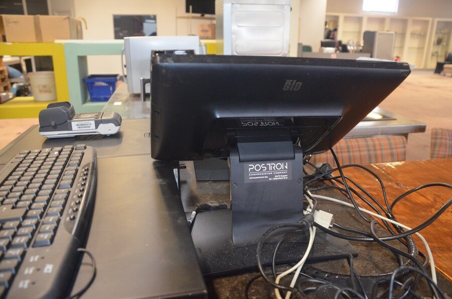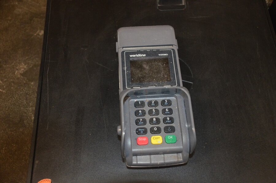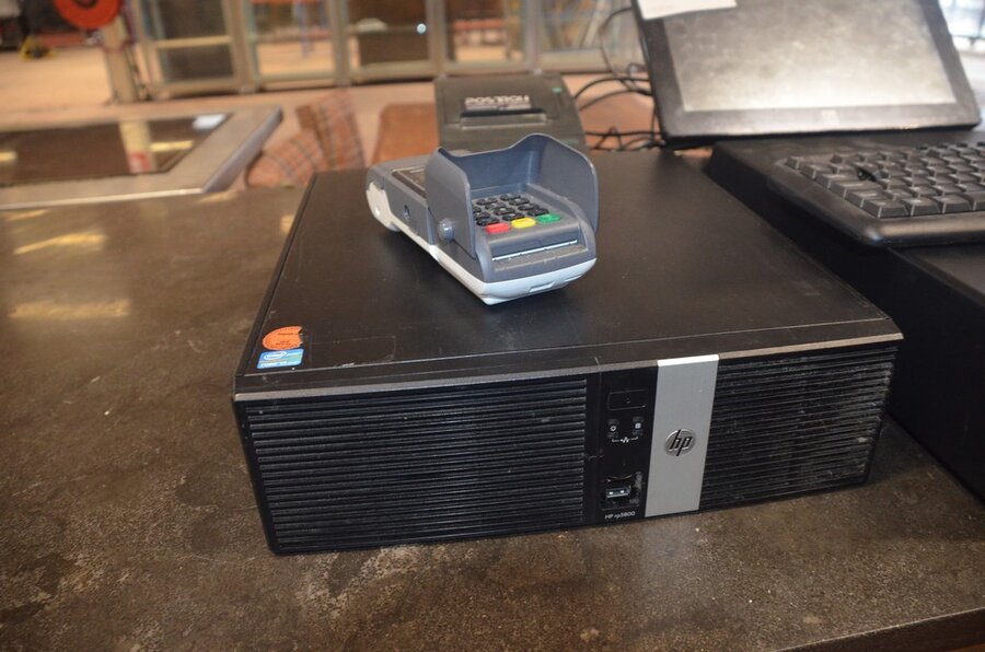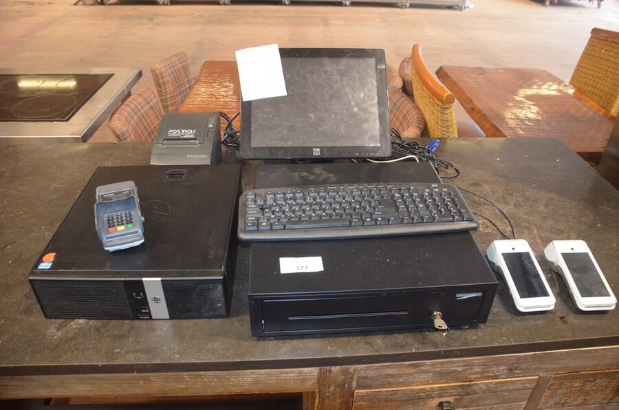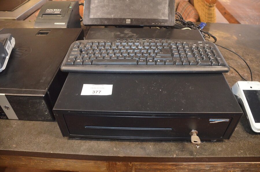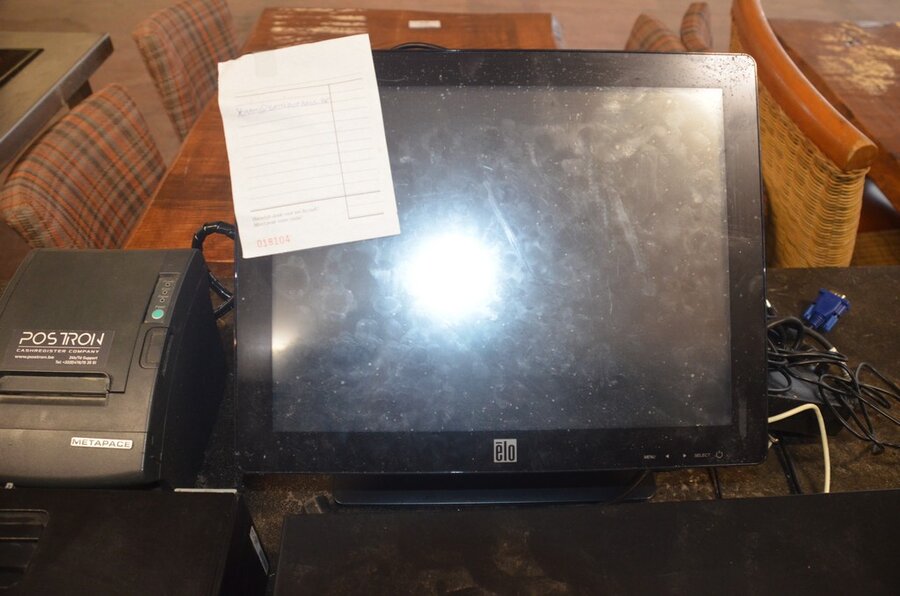 Computerkassa ELO met geldlade en etiketprinter, centrale eenheid HP met toetsenbord, betaalterminal YOXIMO (10,11,12)