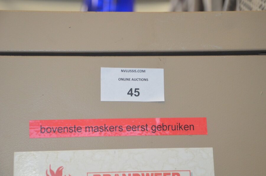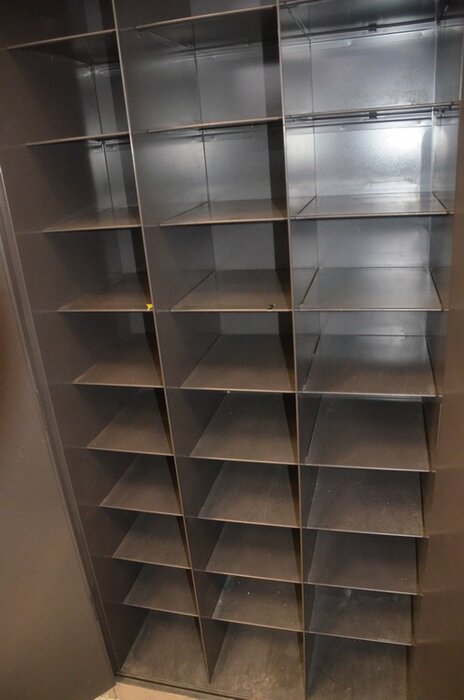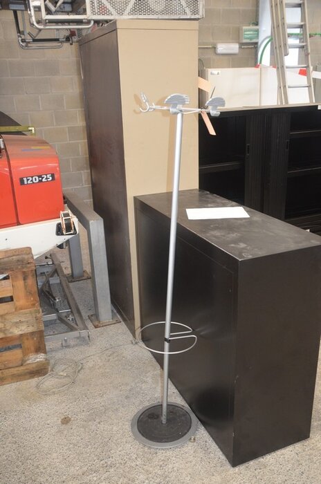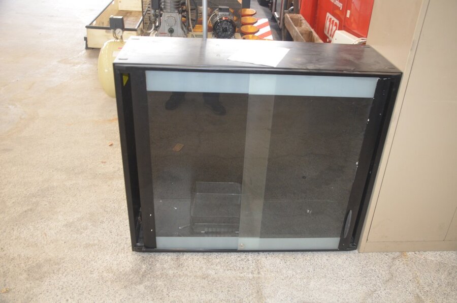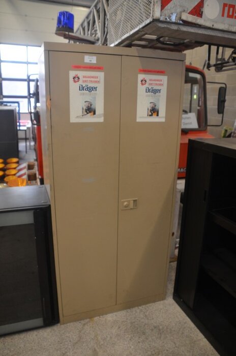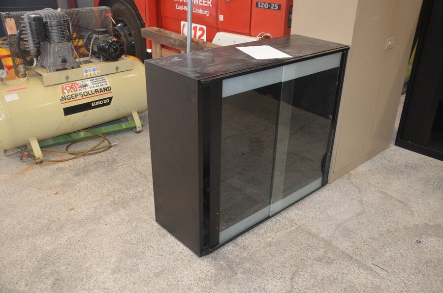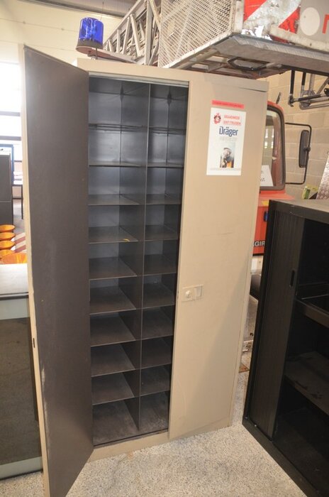 Metalen kast 2 deuren 30 vakken afm. 200x92x48, vitrinekastje laag model afm; 120x46x102 2 schuifdeuren, 2 kapstokken