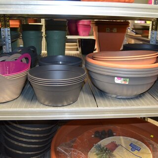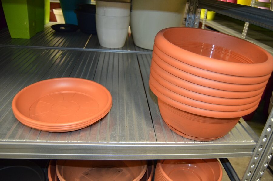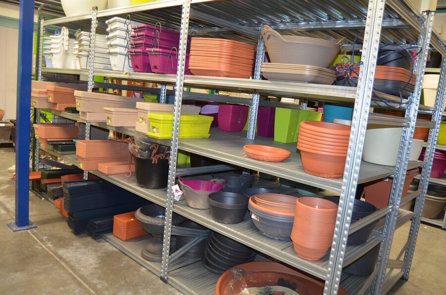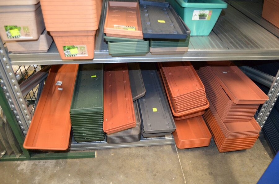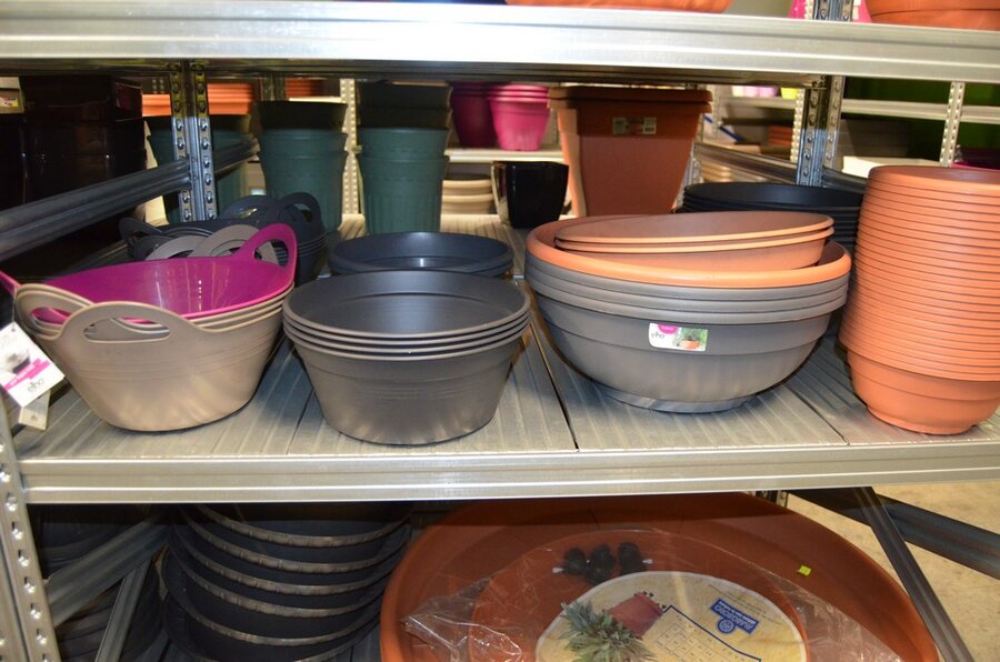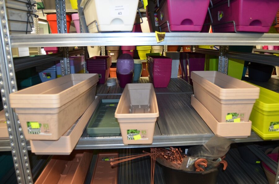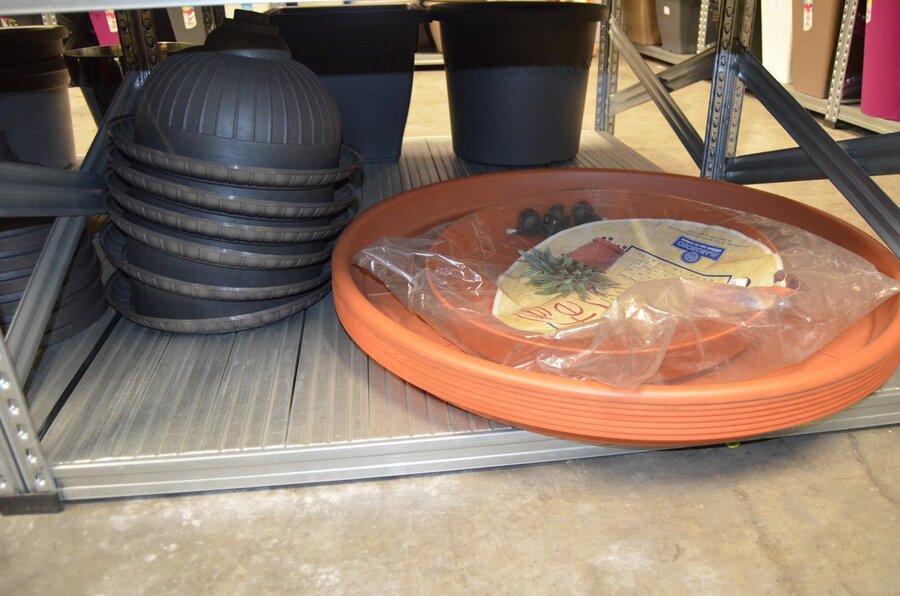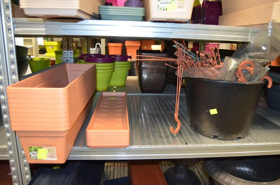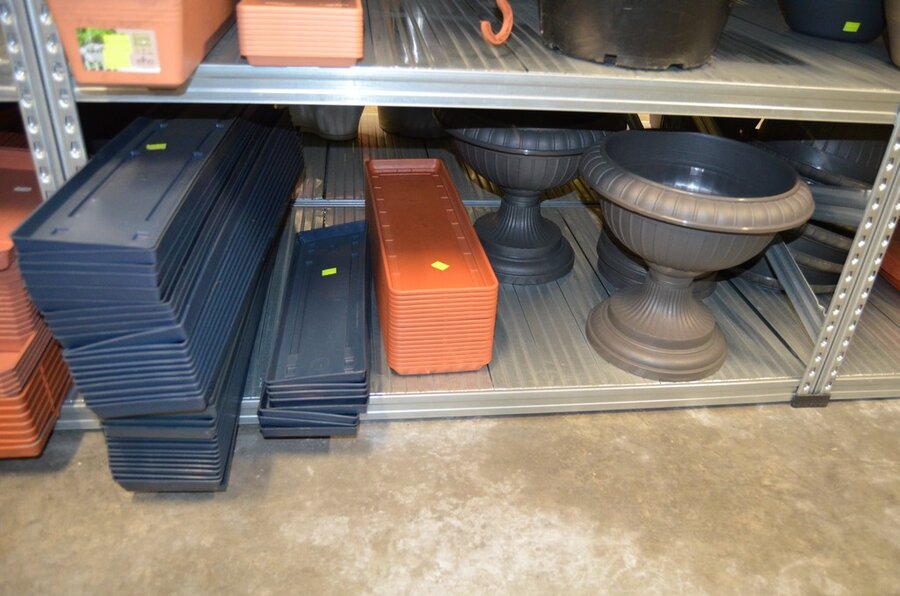 ca 137 BLOEMPOTTEN + grote partij ONDERSCHALEN op 12 leggers