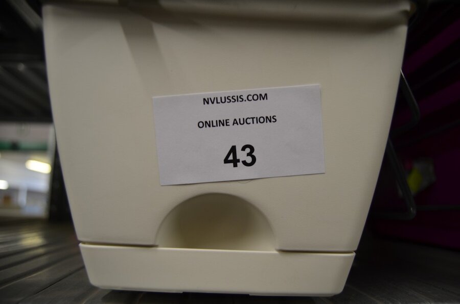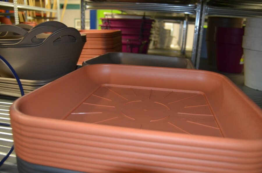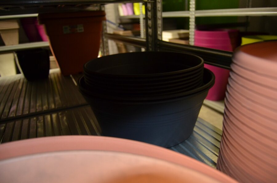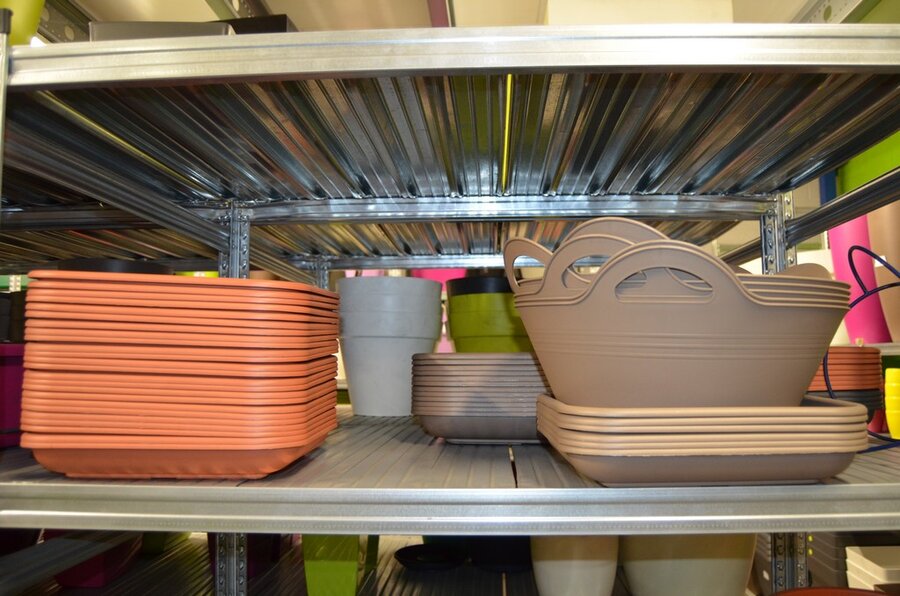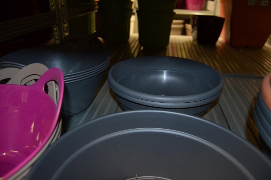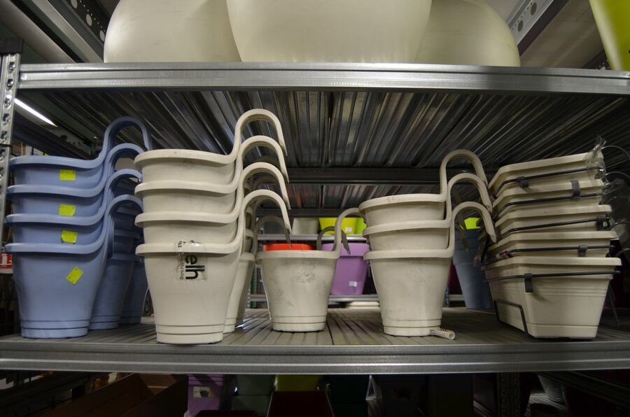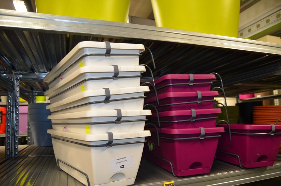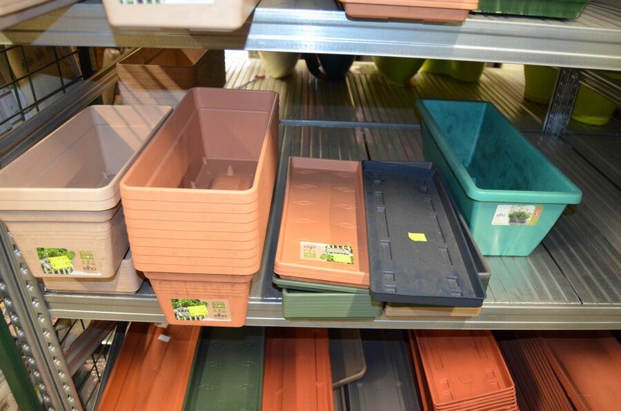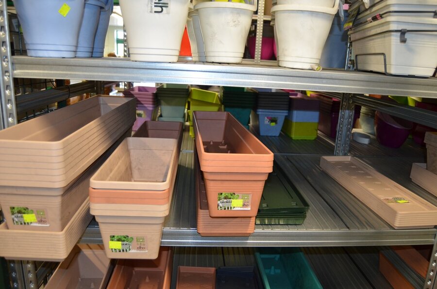ca 137 BLOEMPOTTEN + grote partij ONDERSCHALEN op 12 leggers