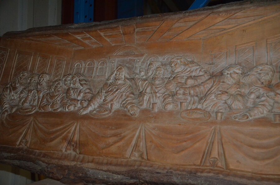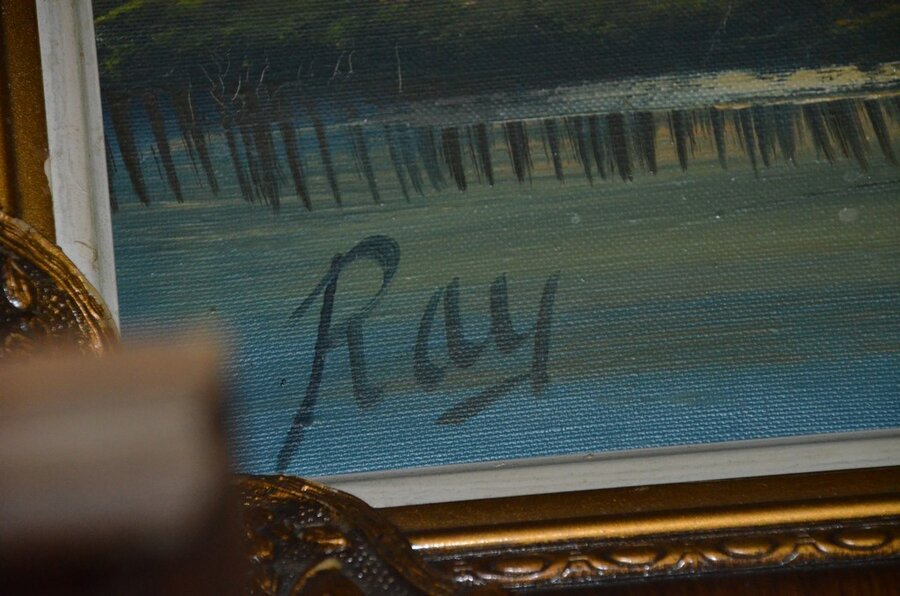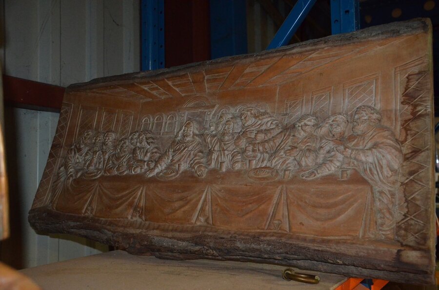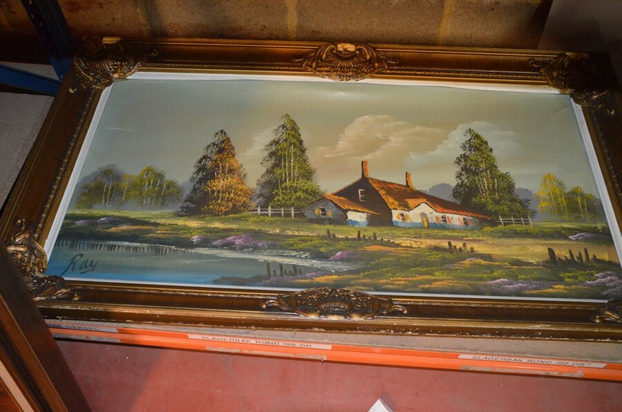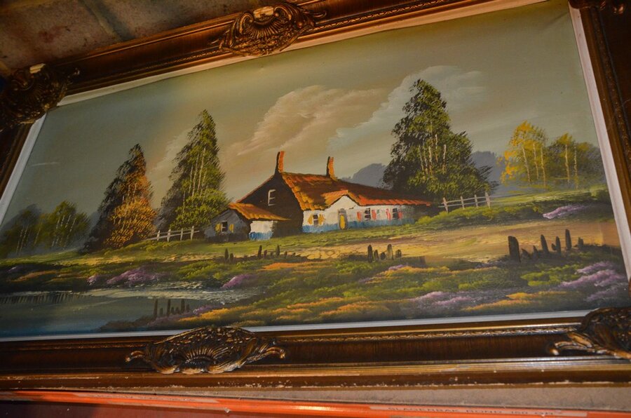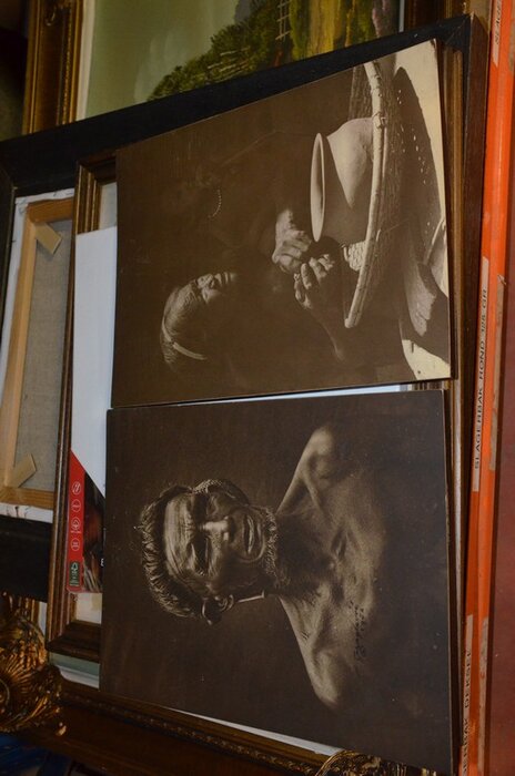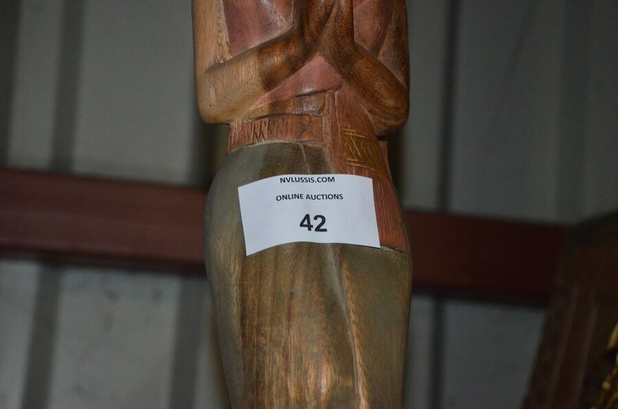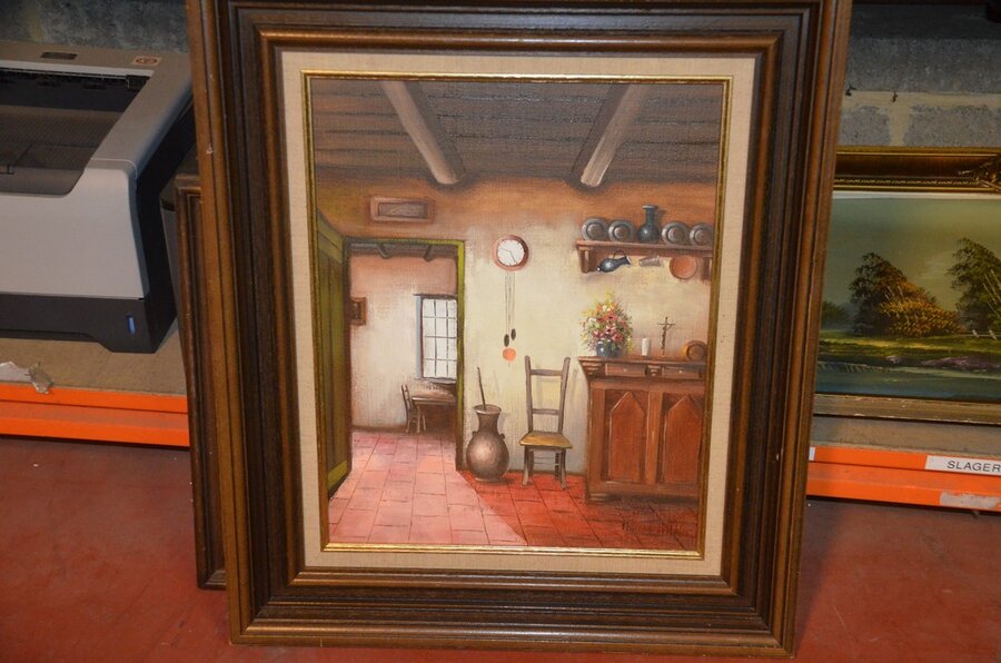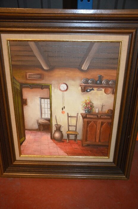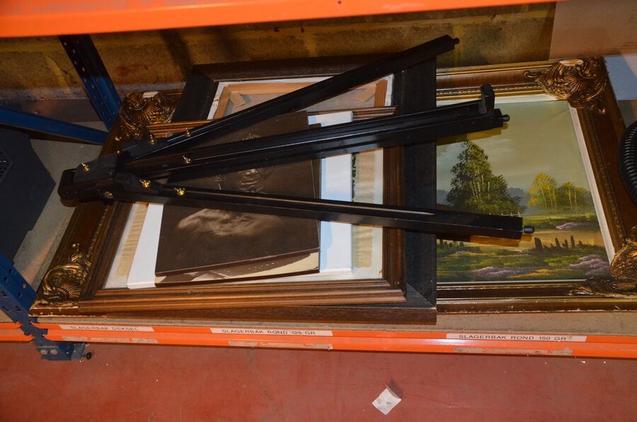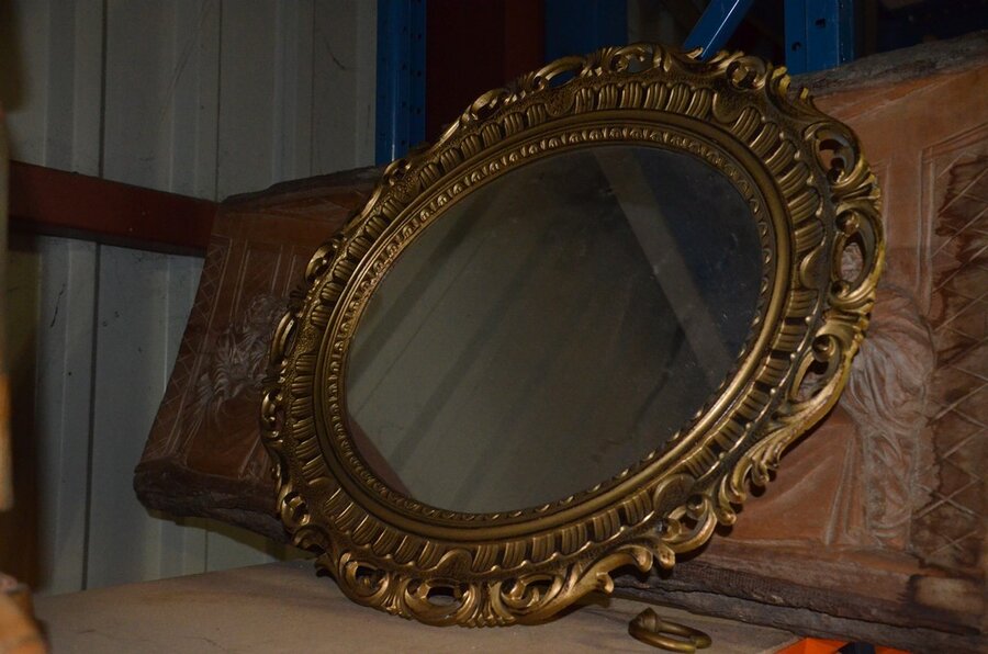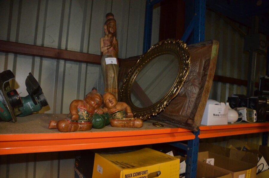 3 Houten beeldjes, houtsnijwerk , ovale spiegel in goudkleurige kader, diverse schilderijen en wandversieringen