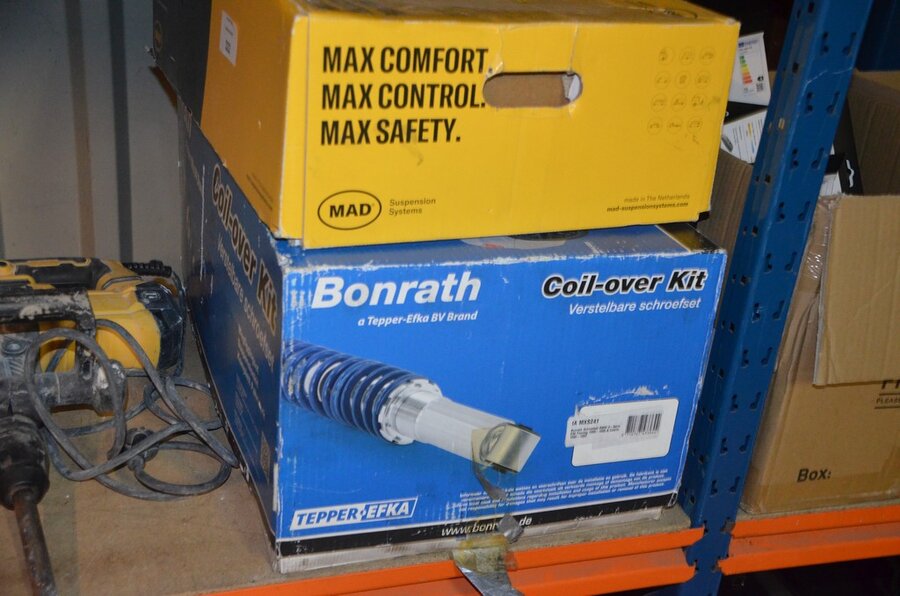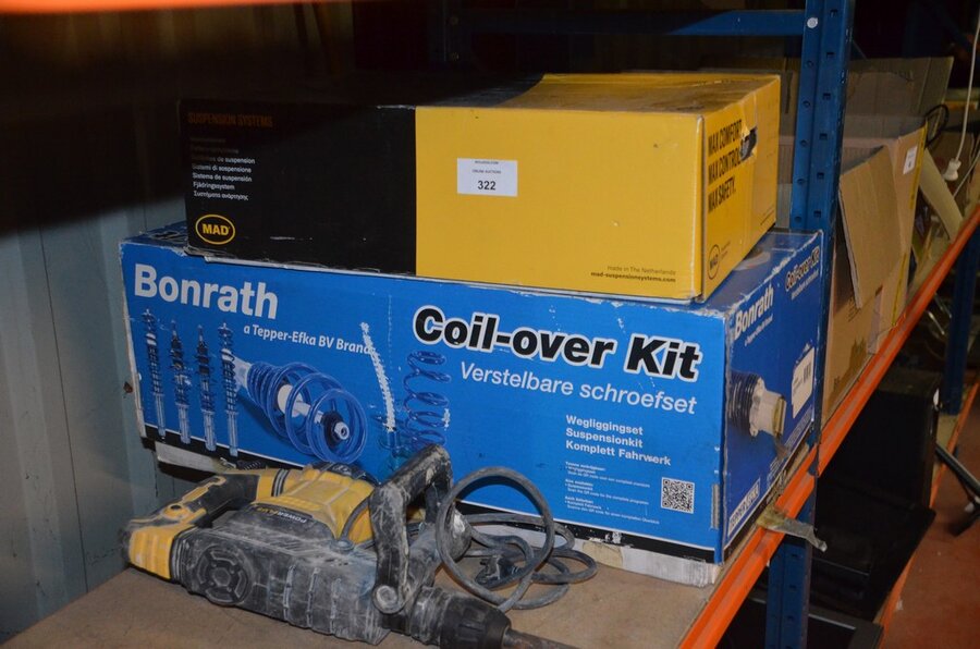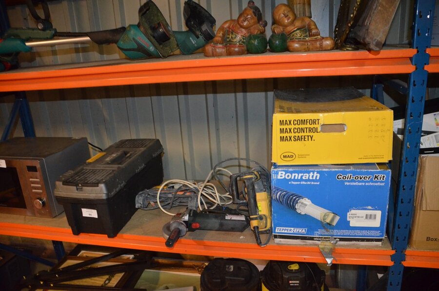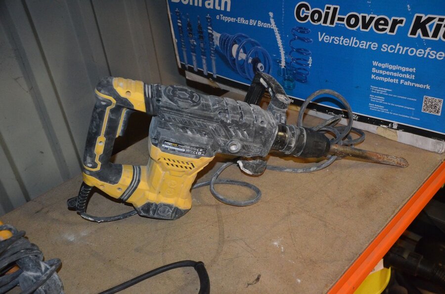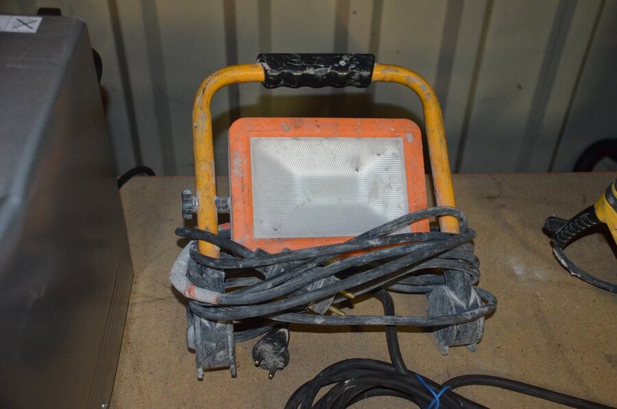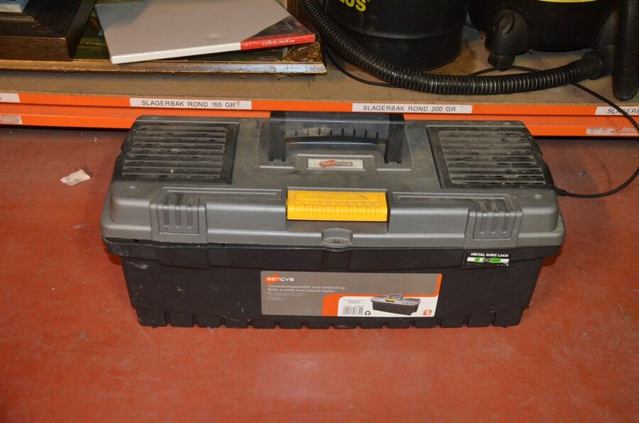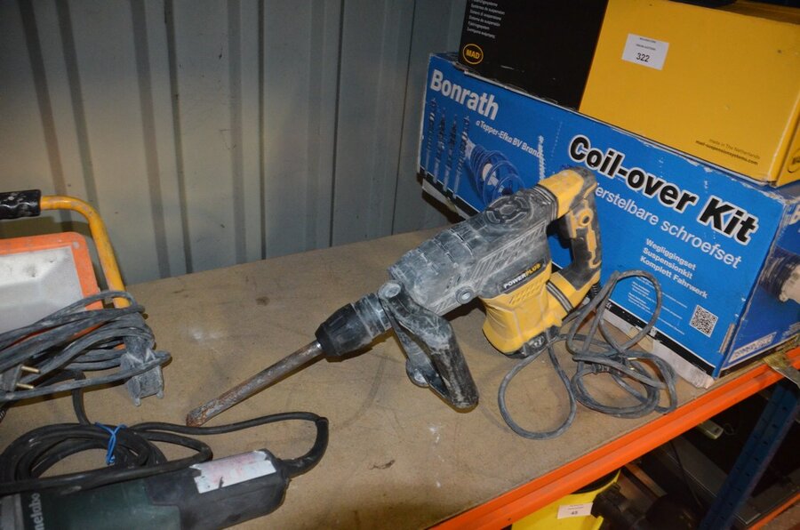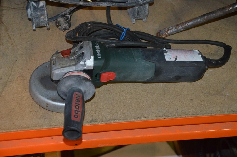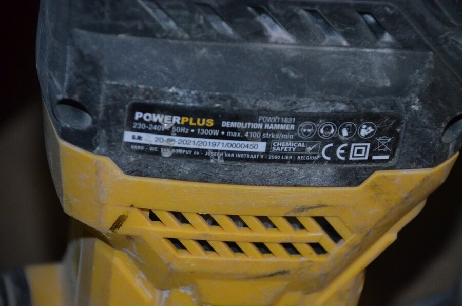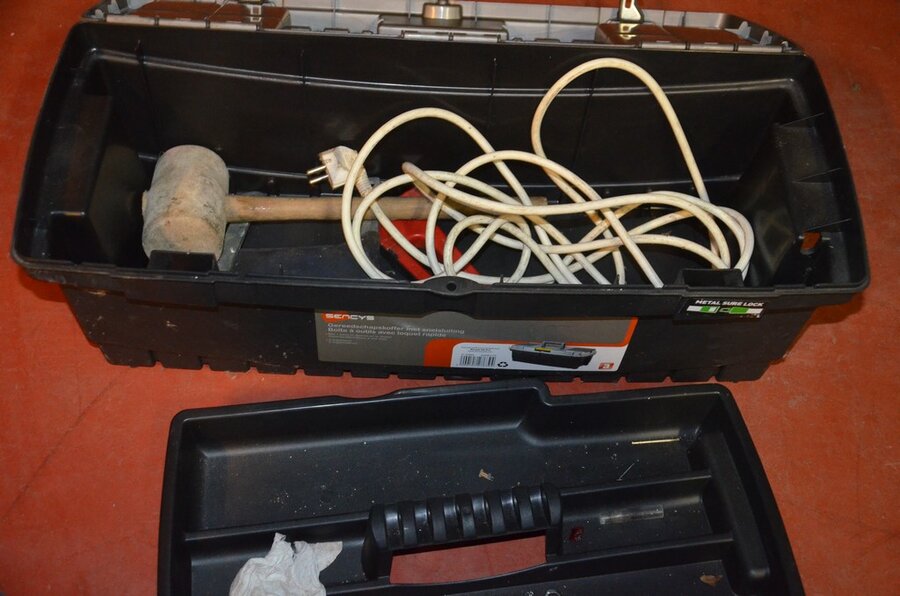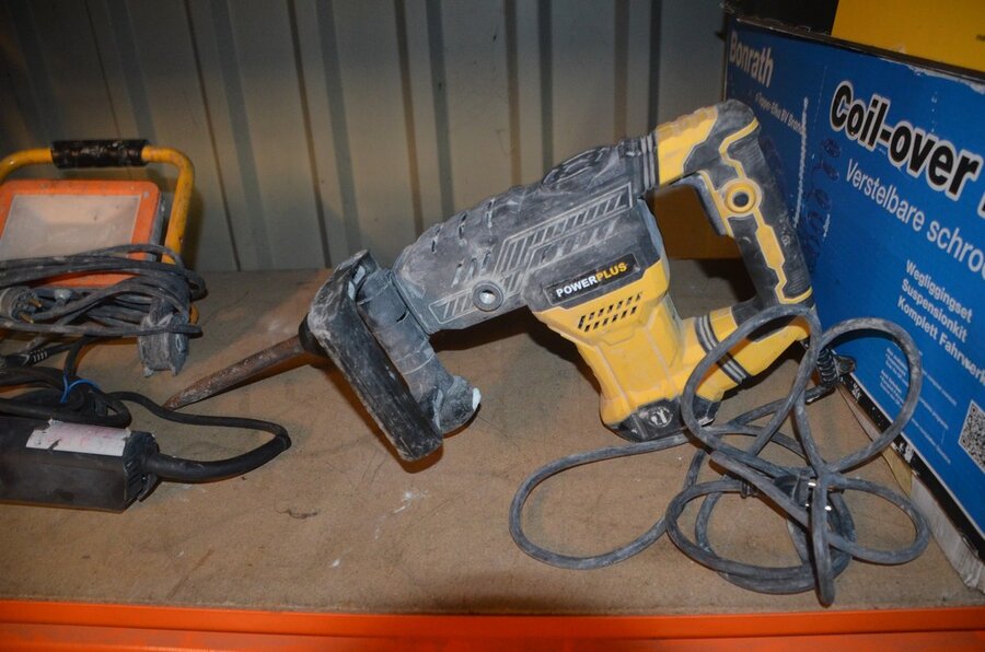 Pvc werkkoffer, boorhamer POWERPLUS POWX11831, slijpschijf METABO (defect), ophanging BONRATH en MAD, 2 led werflampen