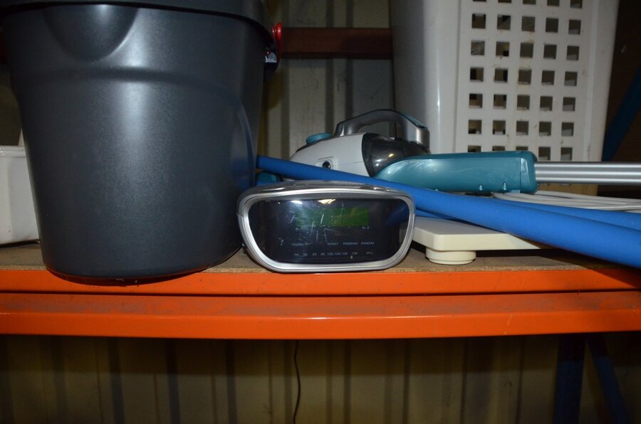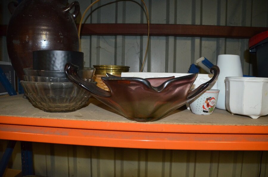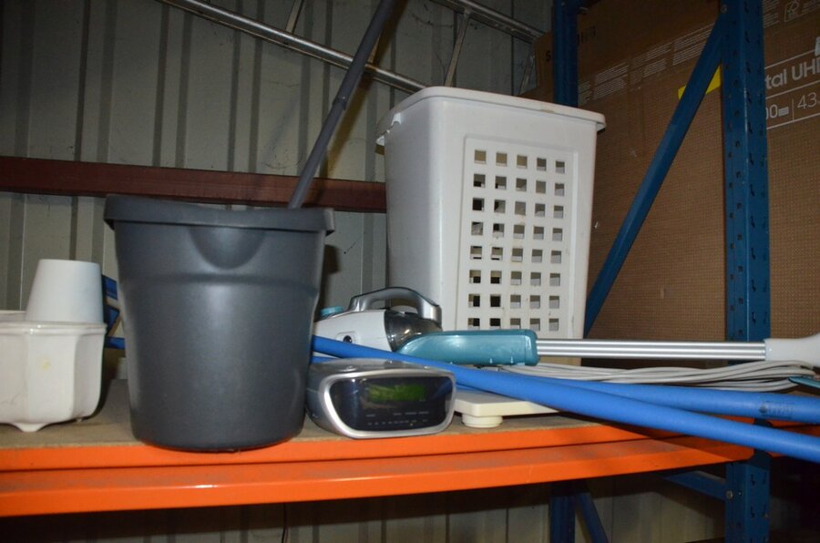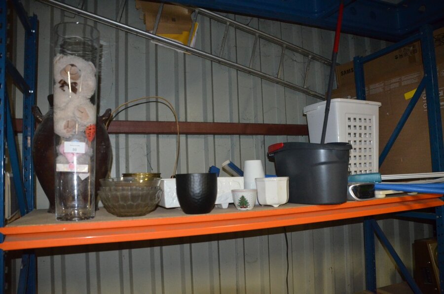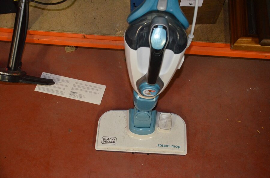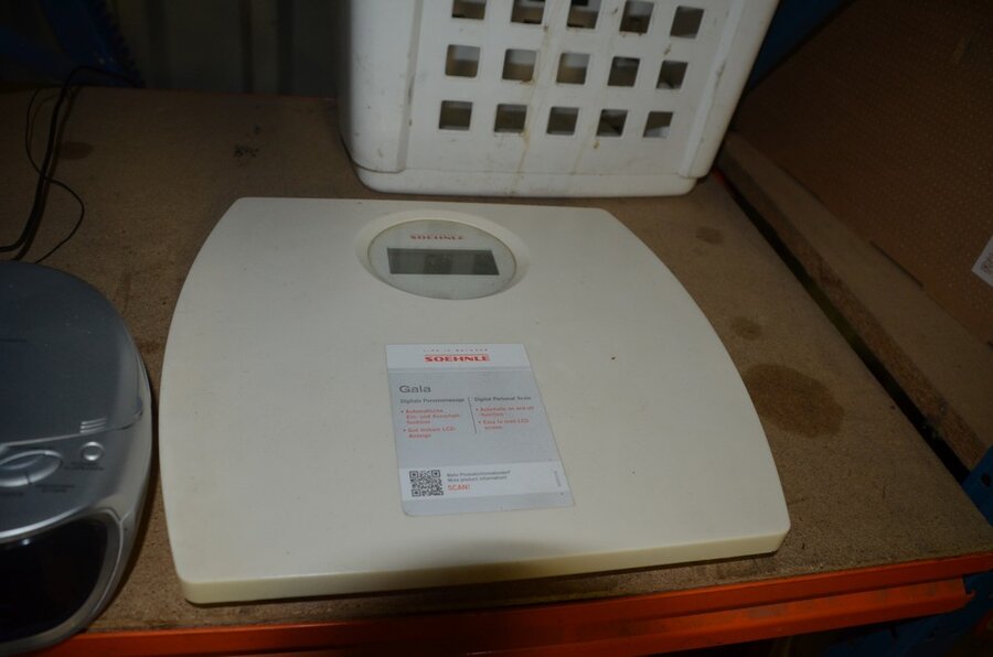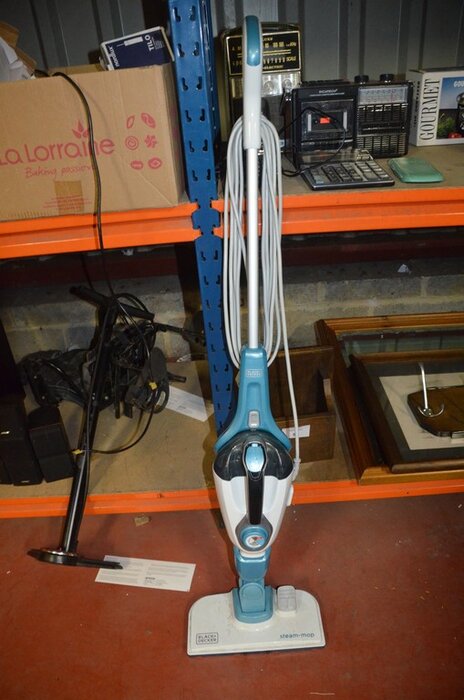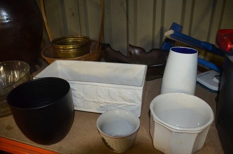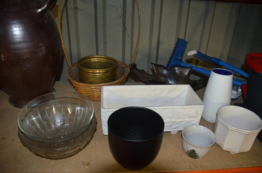 Stoommop BLACK&DECKER, schrobborstel en aftrekker, personenweegschaal SOEHNLE, pvc wasmand, diverse bloempotten en schalen