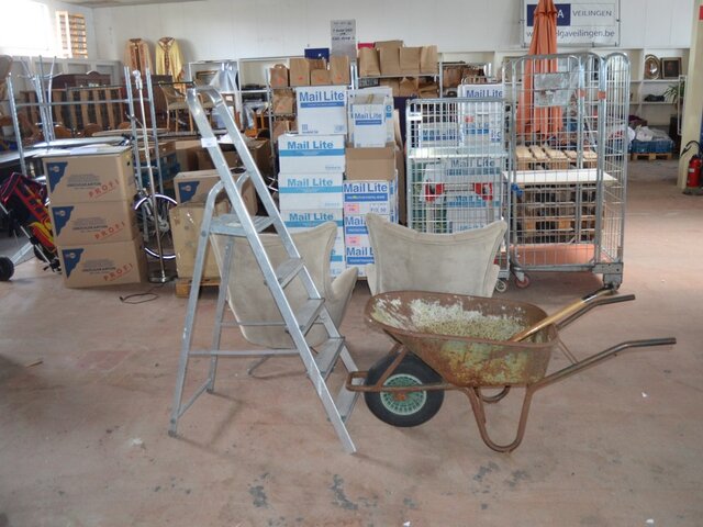 Metalen kruiwagen, hakbijl, alu trapladder 5 treden