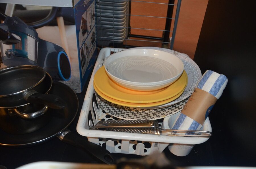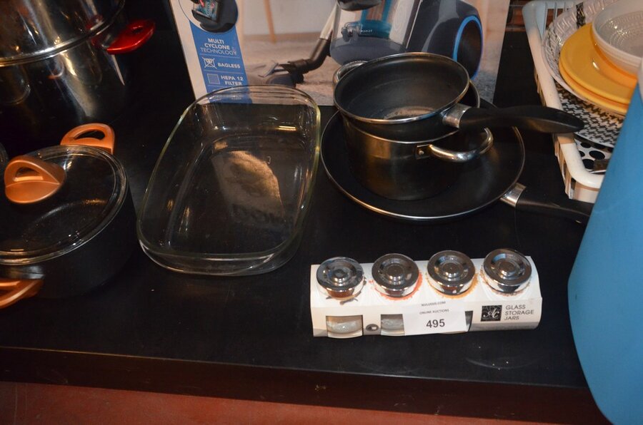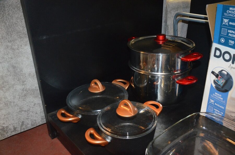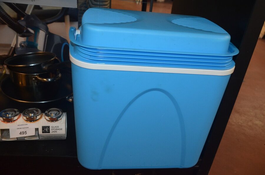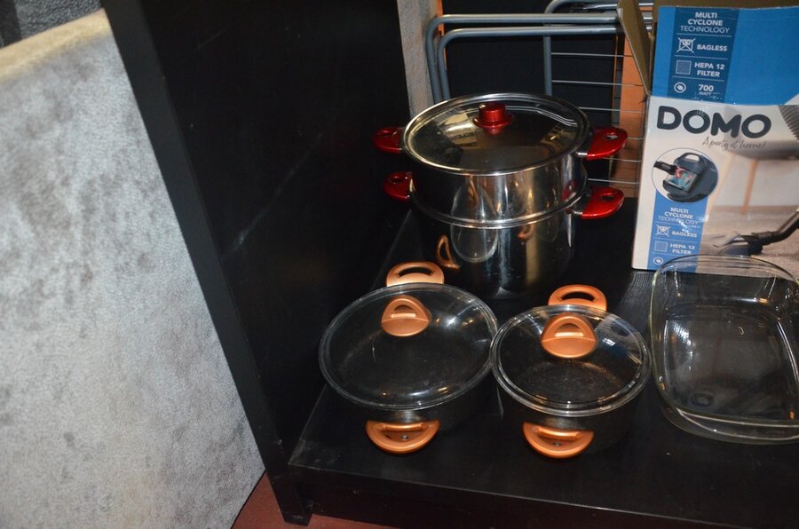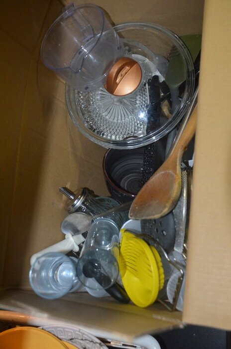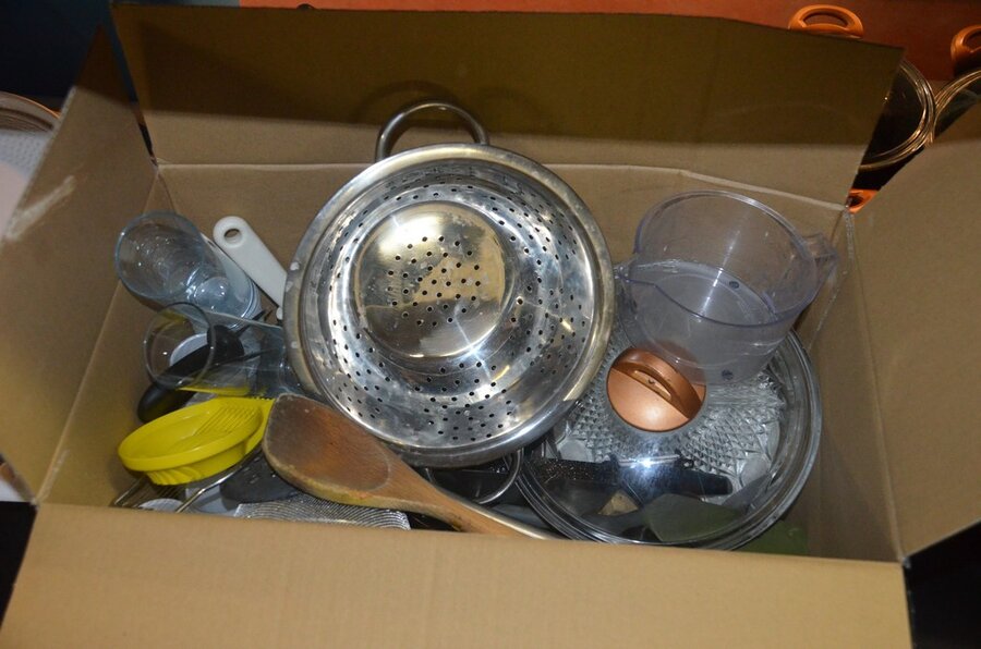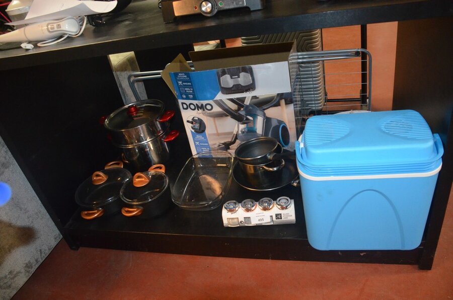 5 Diverse kookpotten, 2 steelpannen, divers keukenmatieraal, frigobox blauw