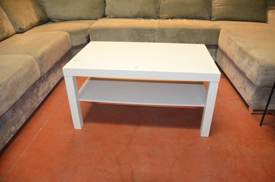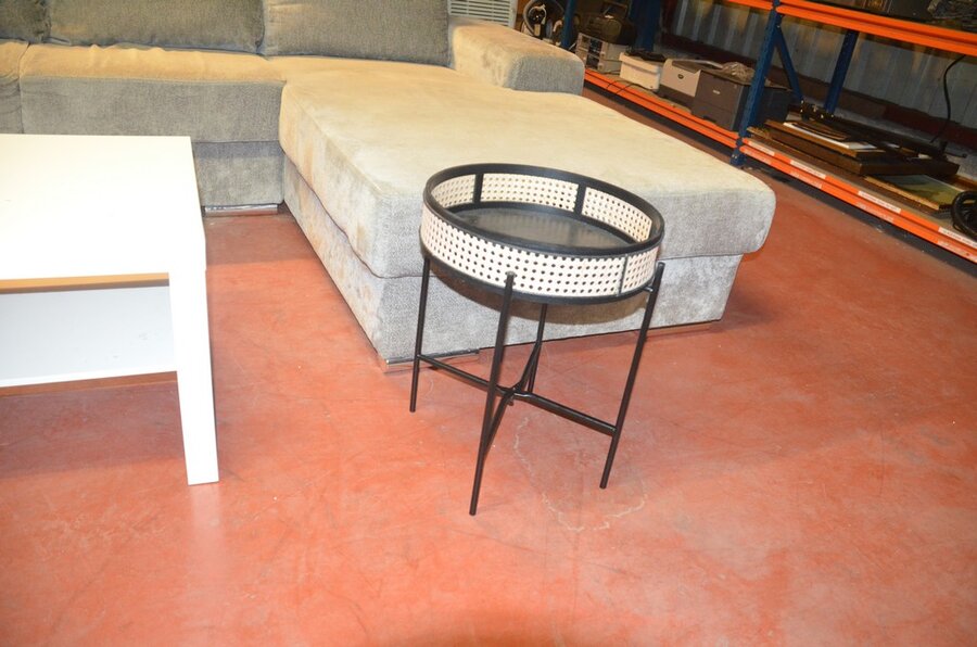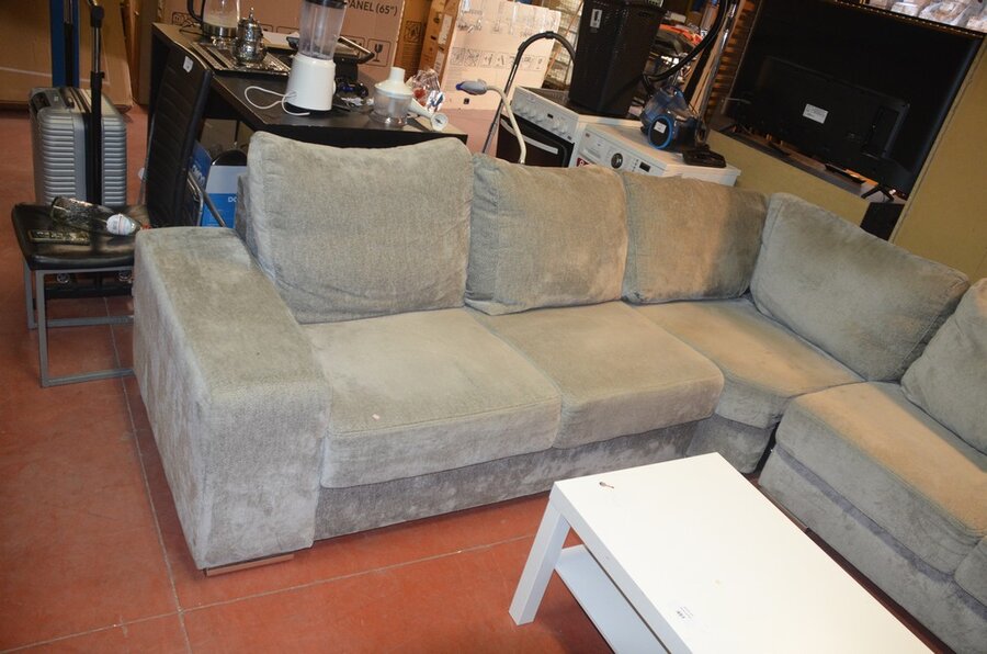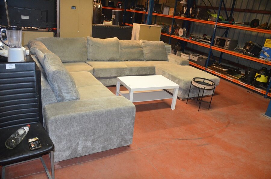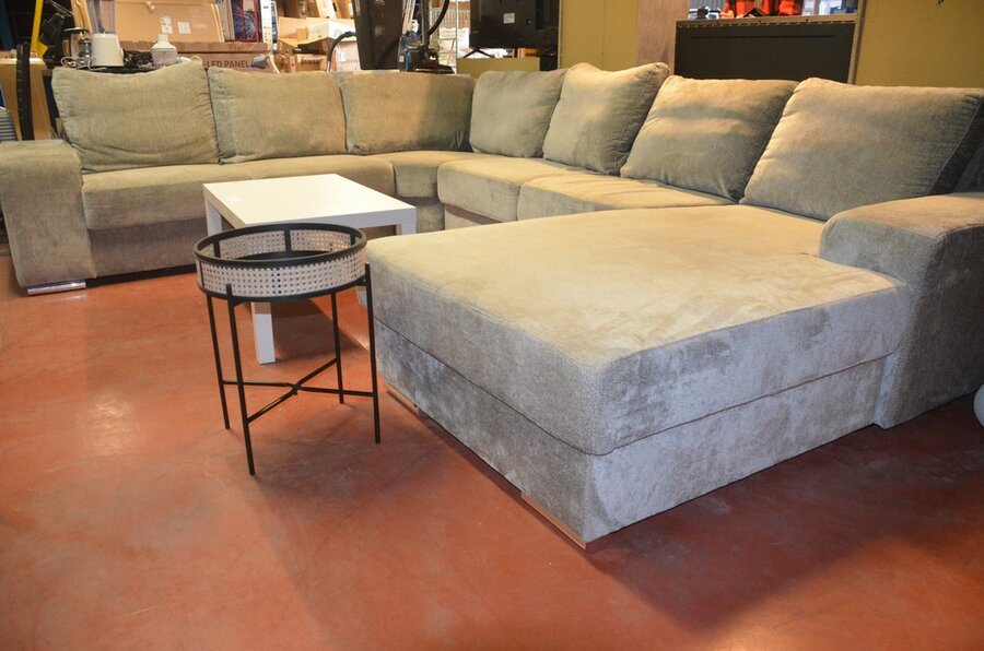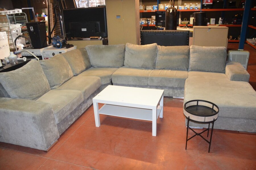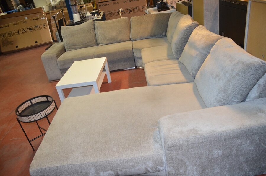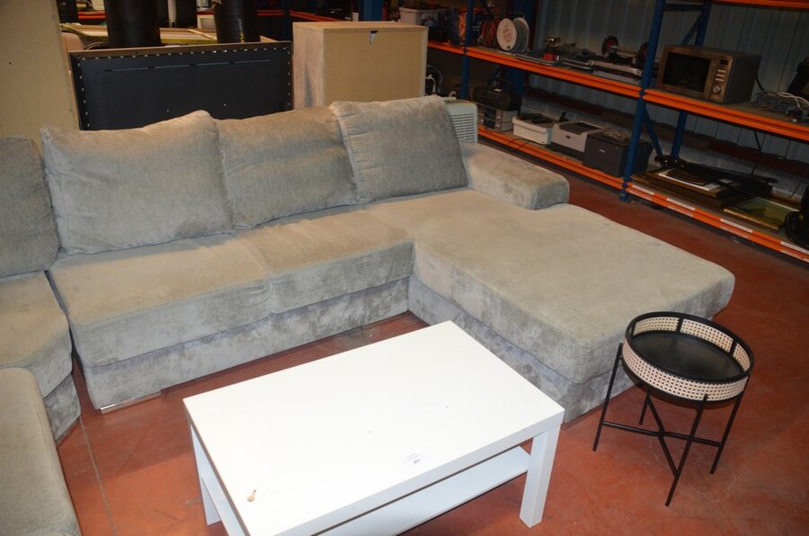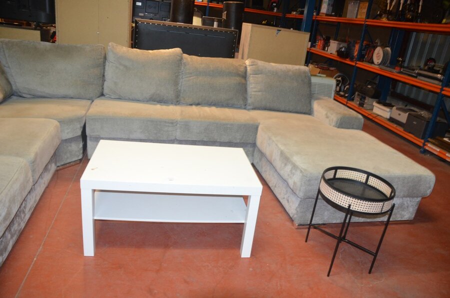 Grijs stoffen u-vormig hoeksalon afm. 350x280, wit rechthoekig salontafeltje, rond zwart bijzettafeltje