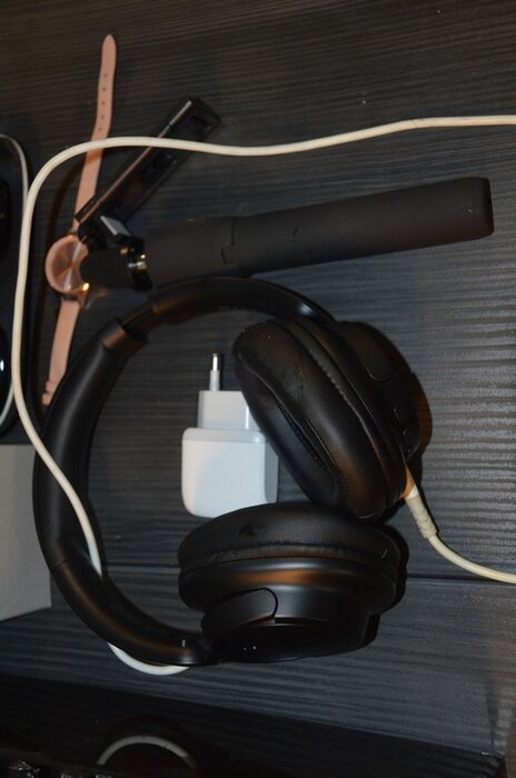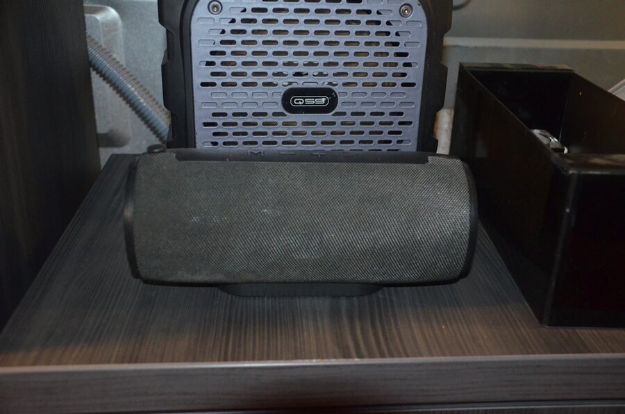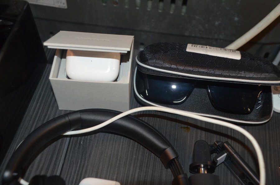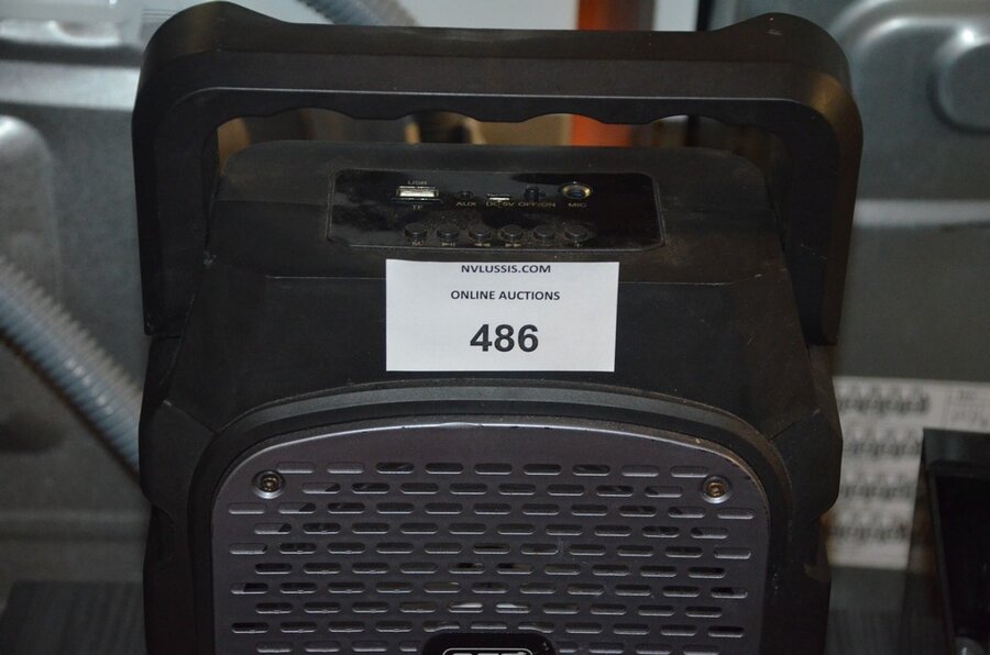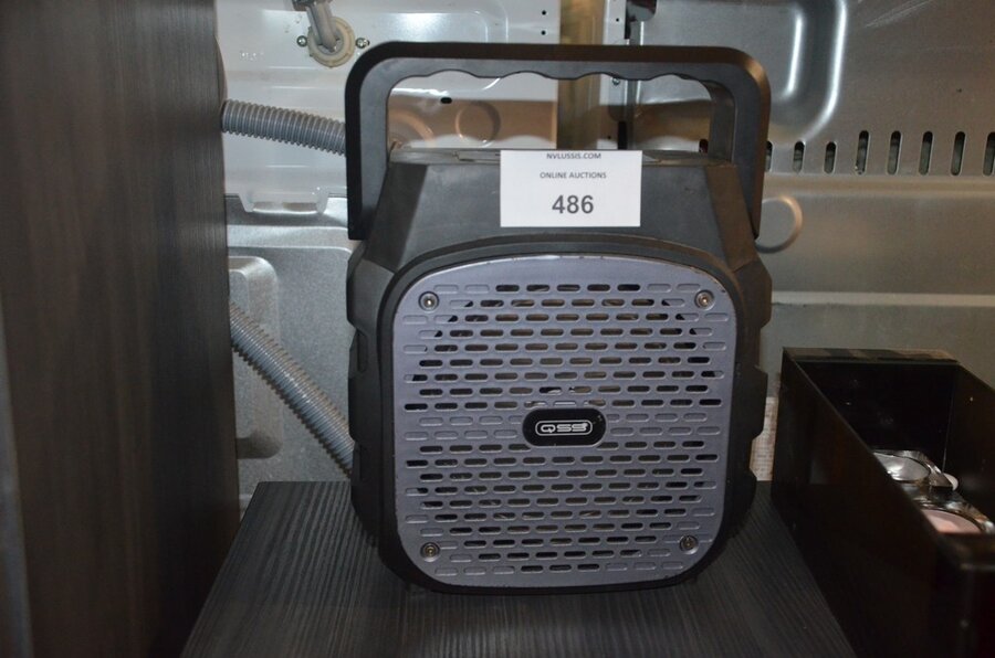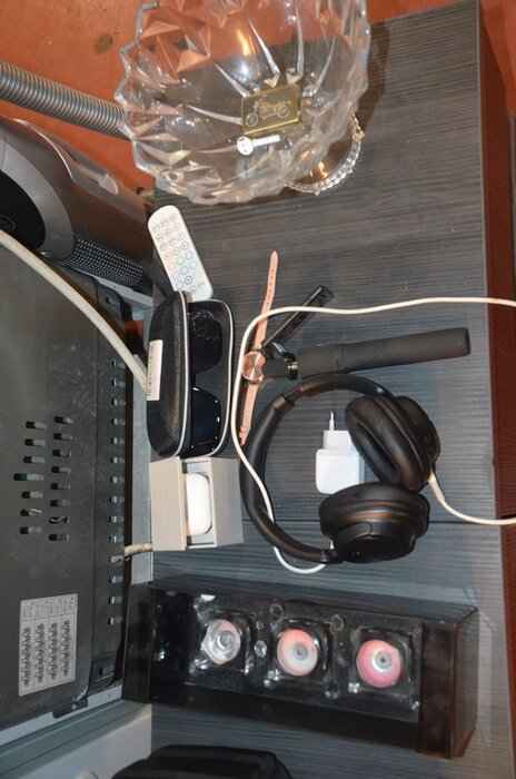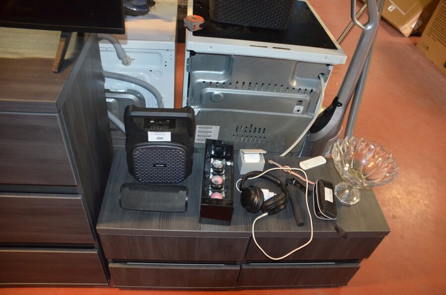 Speaker QSS, bluetooth speaker zonder merk, theelichthouder, selfiestick, damesuurwerk, zonnebril in etui, aansteker, koptelefoon, glazen schaal op voet