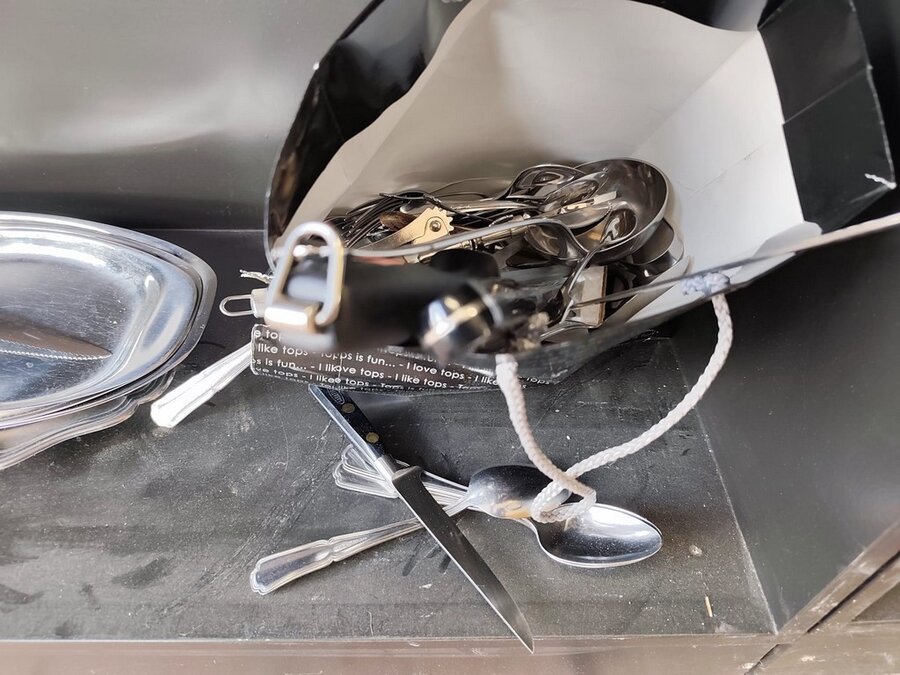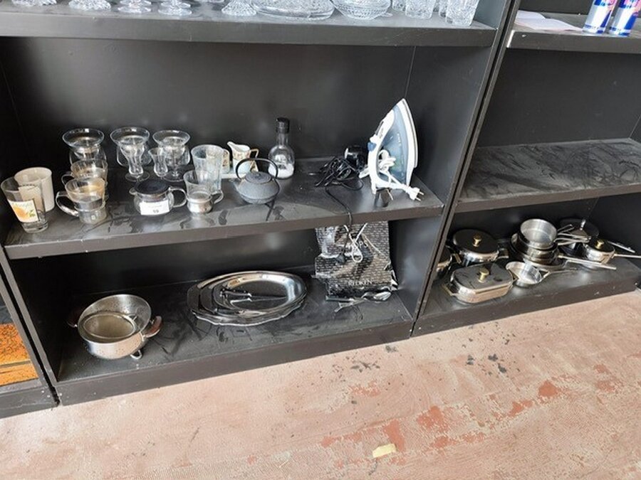 11 Potten en pannen, 4 inox schalen, zak met divers bestek, 10 glazen, haardroger, stoomstrijkijzer BOSCH