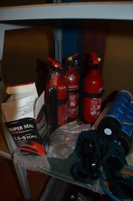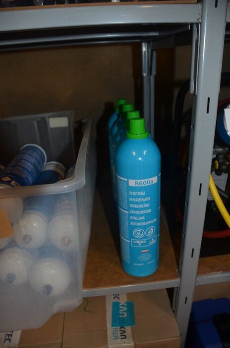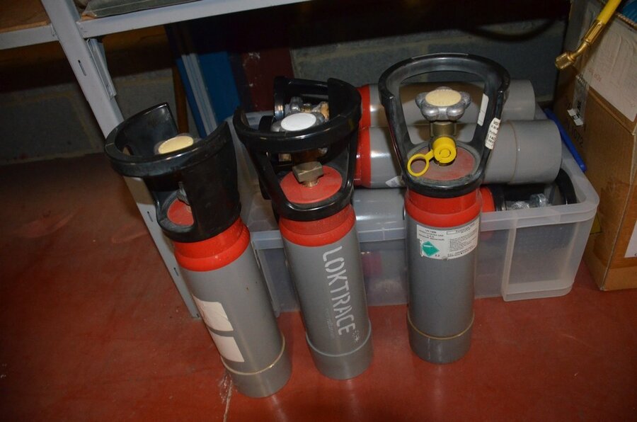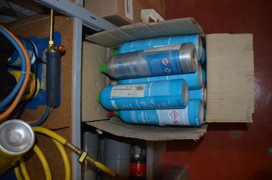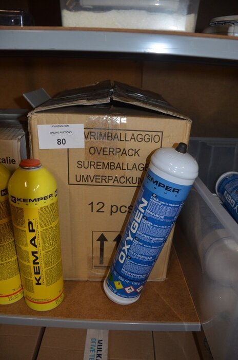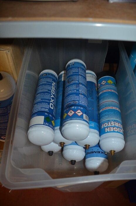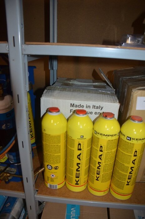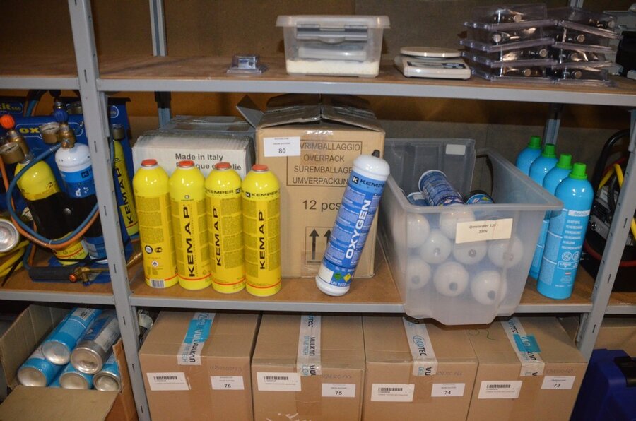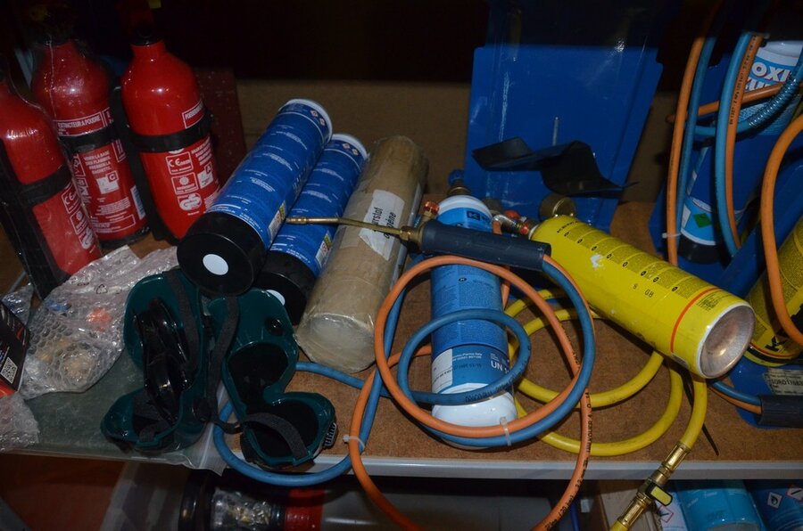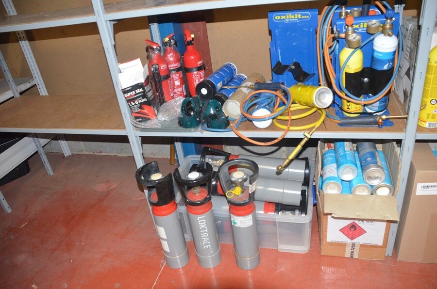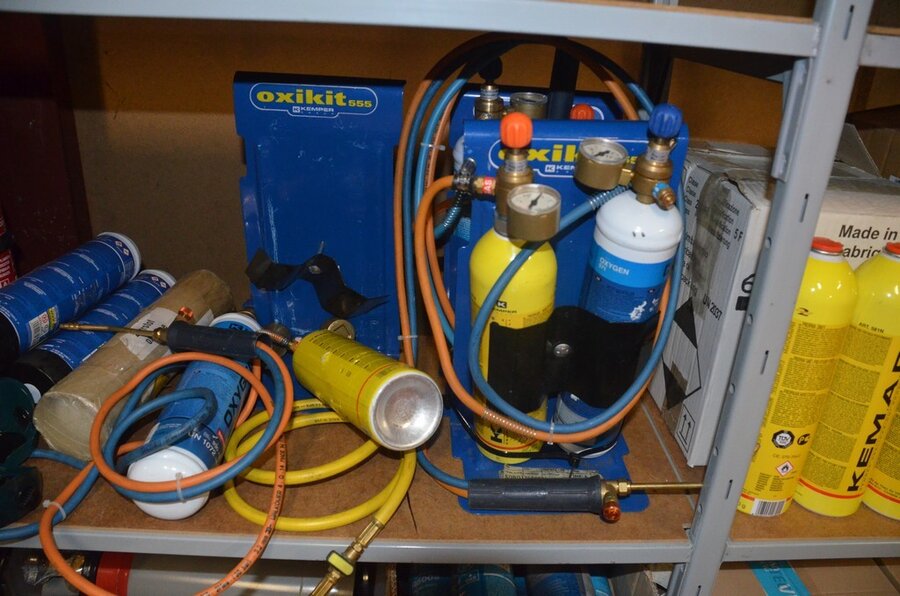 4 flessen ISOBUTANE, 20 flessen zuurstof, 16 flessen propaan, 3 soldeerkits OXIKIT 555, 3 lasbrillen, 3 poederbrandblussers 1kg, 11 gasflessen formiergas NWS (b423)